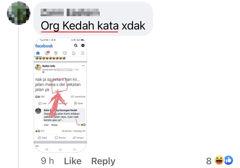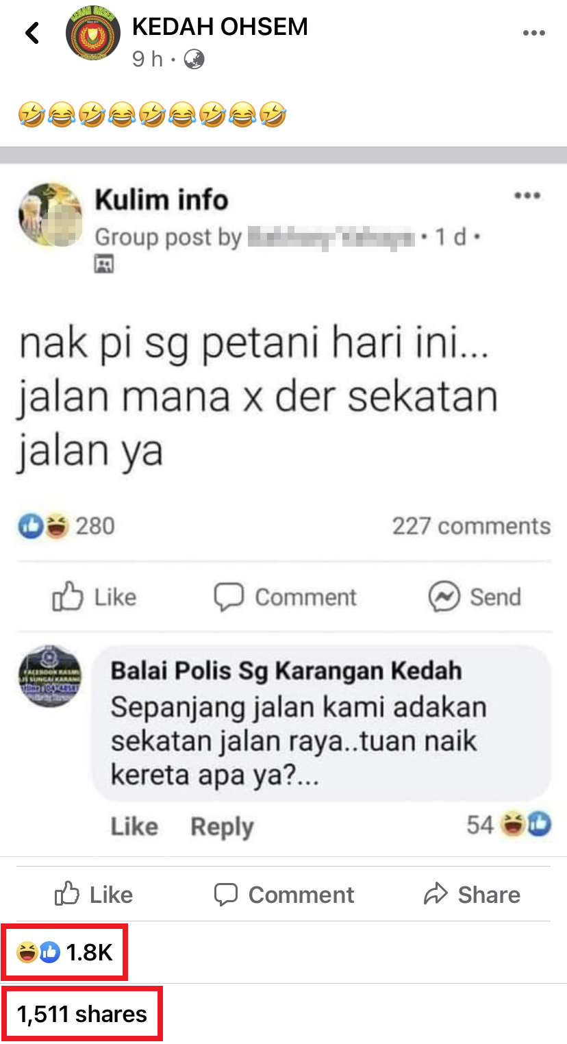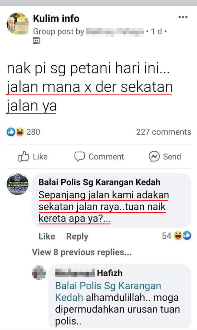 吉打加拉岸(Sungai Karangan, Kedah)的警局官方脸书留言回复:「我们沿路上都有设路障,请问先生乘坐的是什么车?」