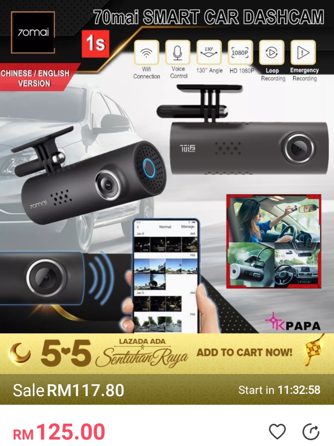 ▼① Mijia Youpin 70Mai 70 Mai 1s Minutes Smart WIFI Car Cam DashCam – RM125 RM117.80(5月5日优惠价)