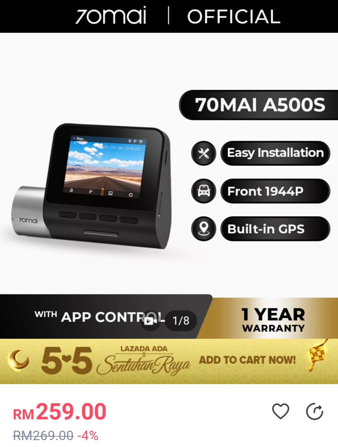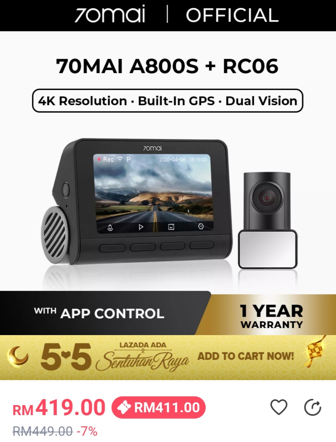 ▼③ 70mai A800S Dual-vision 4K With Rear Cam Dash Cam – RM449 RM411(此价格必须领取店家的优惠券才能获得)