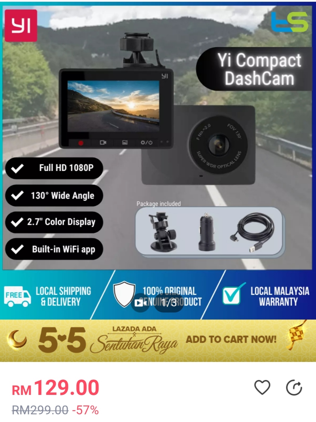 ▼⑥ Xiaoyi Yi Compact DashCam – RM299 RM129