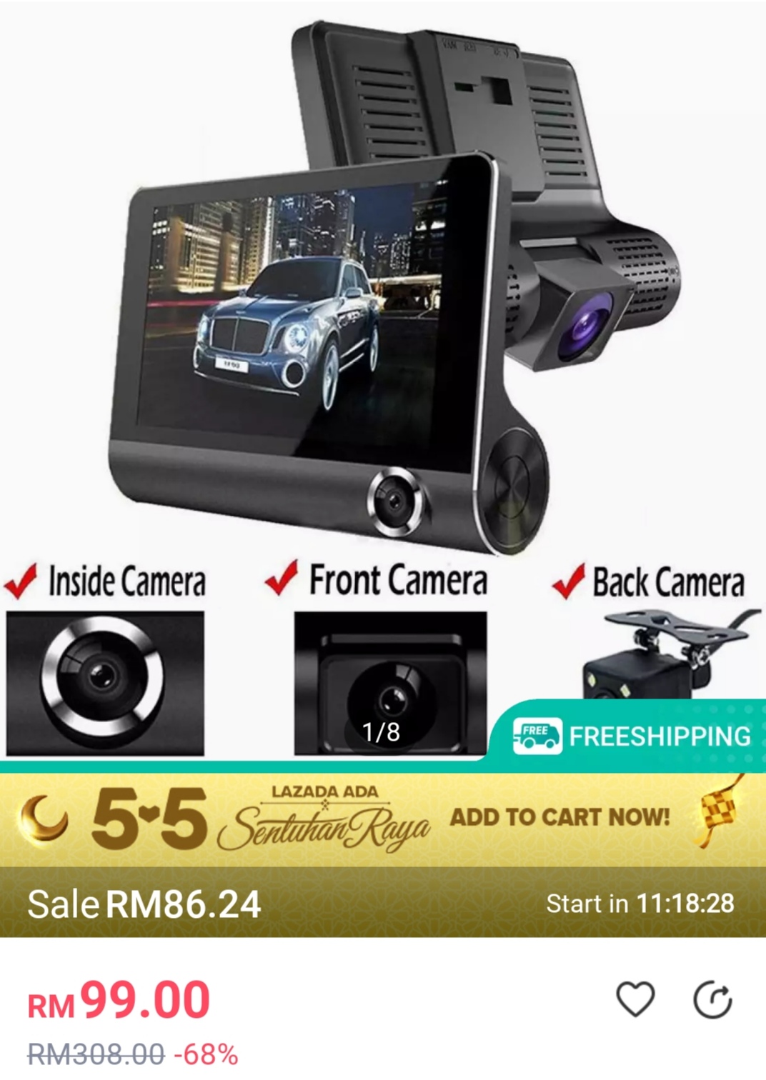 ▼⑦ 3 Lens Car Dash Cam HD Video Recorder with Front + Interior + Rear Camera (Mayi) – RM308 RM86.24(5月5日优惠价)