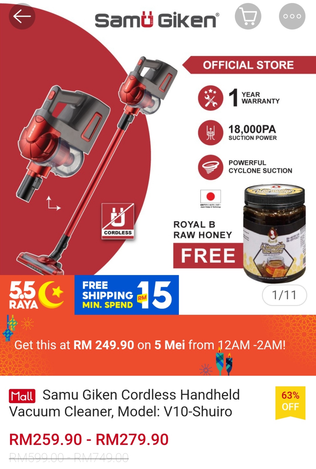 ▪ Samu Giken Cordless Handheld Vacuum Cleaner, Model: V10-Shuiro – RM599 RM249.90【点击这里】