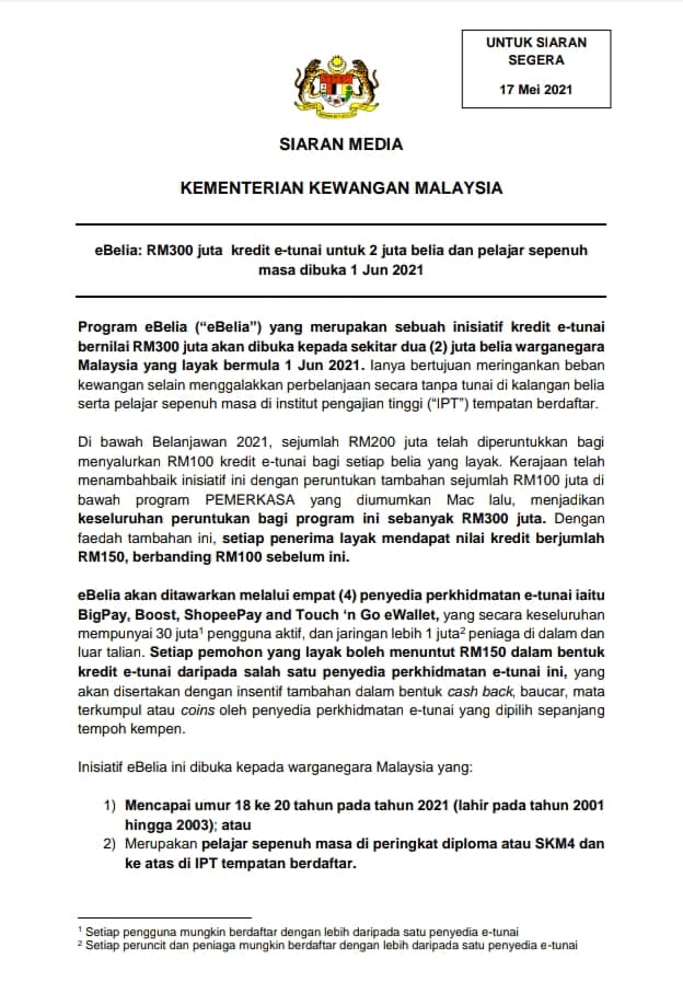 此项eBelia 计划将会通过4种平台发放:BigPay,Boost,ShopeePay 和Touch ‘n Go eWallet。只要你是介于2001 至2003 年出生的18岁至20岁青年、就读Diploma/SKM4 或以上的全职大马学生,你就符合资格申请。