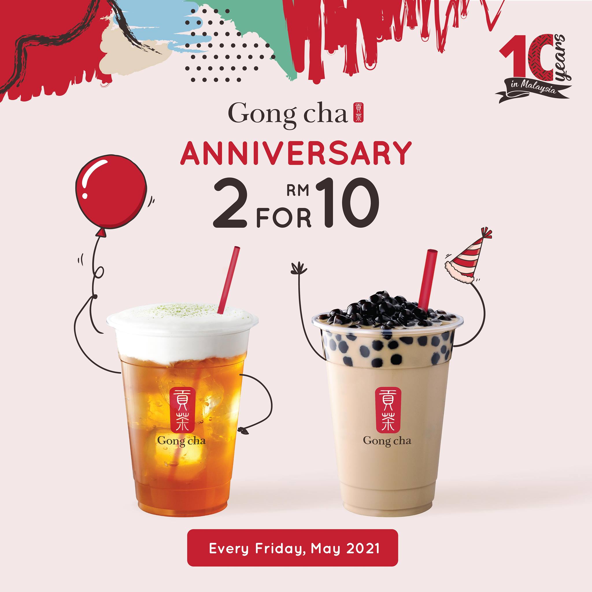 为了配合Gong Cha 10周年庆,将在每逢星期五推出2杯饮料只需RM10!平均一杯只需RM5!