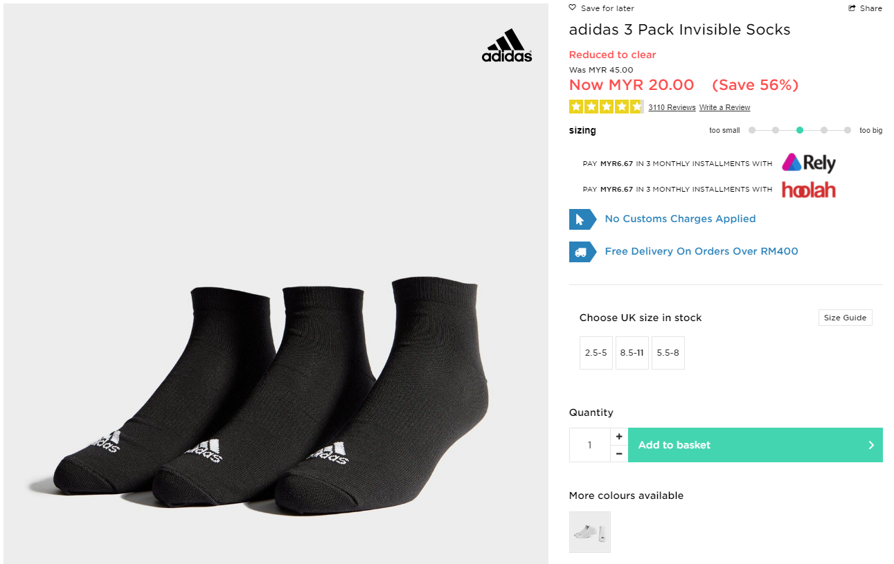 ▼adidas 3 Pack Invisible Socks【折扣56%】- 只需RM20(原价 RM45)