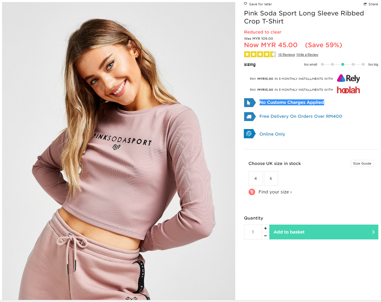 ▼ Pink Soda Sport Long Sleeve Ribbed Crop T-Shirt【折扣59%】- 只需RM45(原价 RM109)