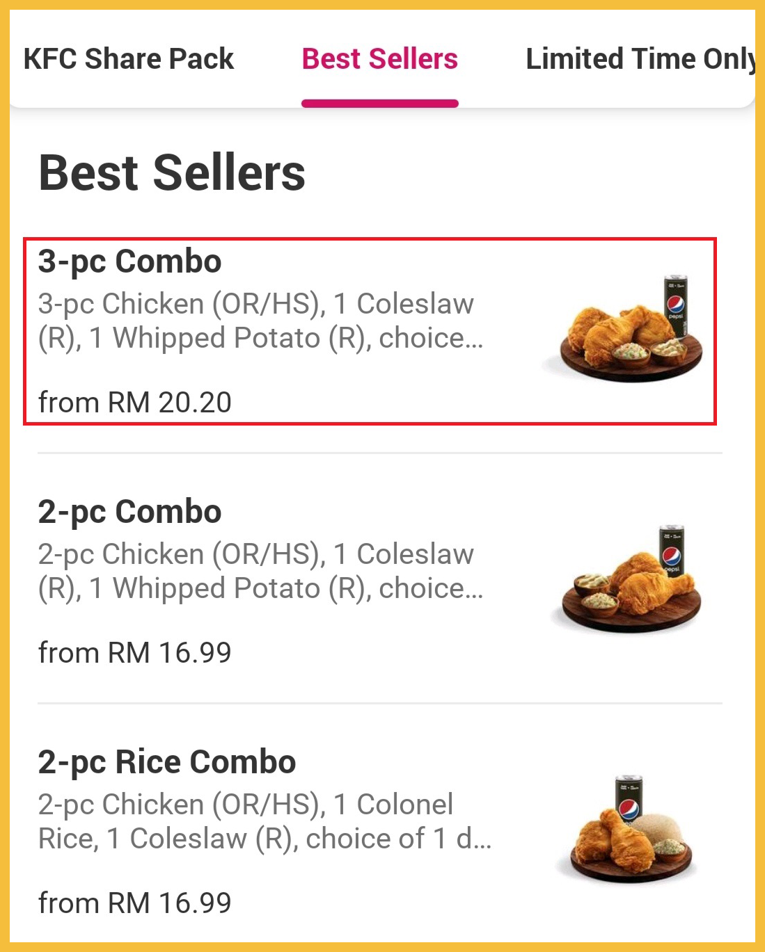 步骤2:选择你要的美食或套餐,例如:3-pc Combo!
