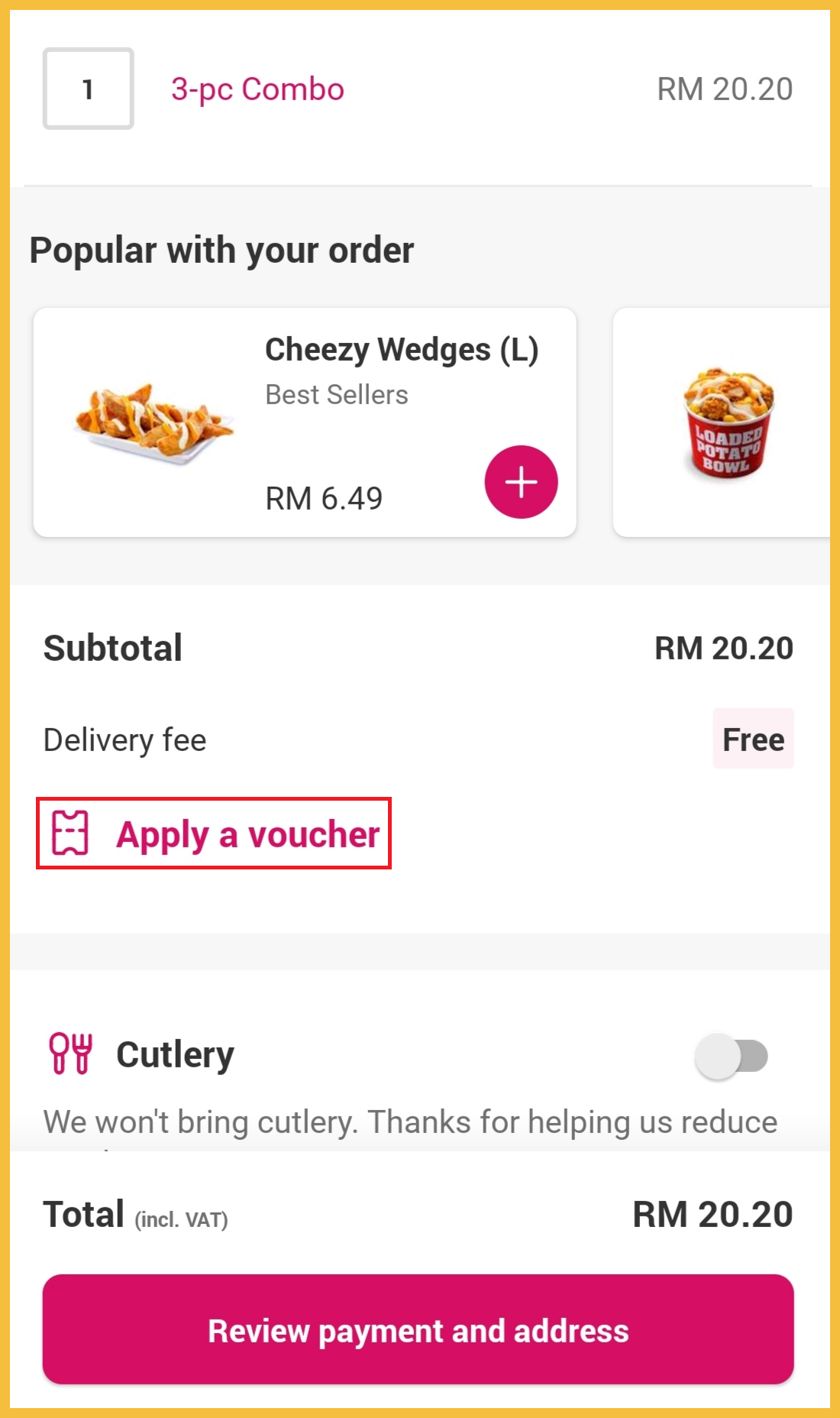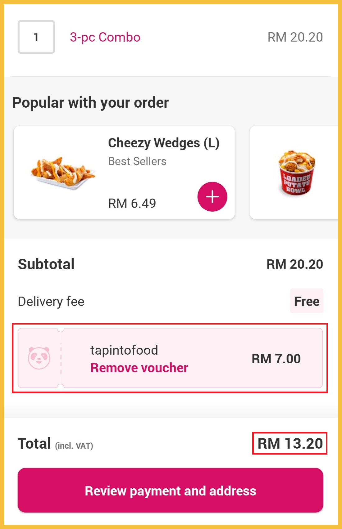 ※ 一份3-pc Combo(原价RM20.20),折扣【TAPINTOFOOD】优惠码后只需RM13.20!