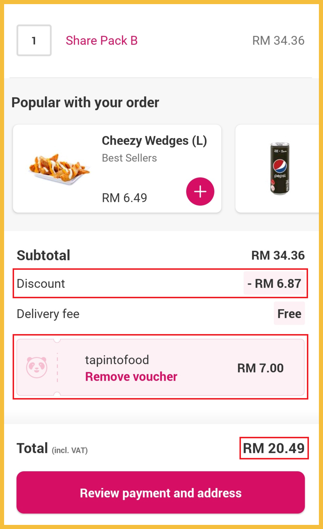▼ 一份2人Share Pack B套餐(原价RM34.36),折扣20%+【TAPINTOFOOD】优惠码后只需RM20.49!平均一人只需RM10.25!