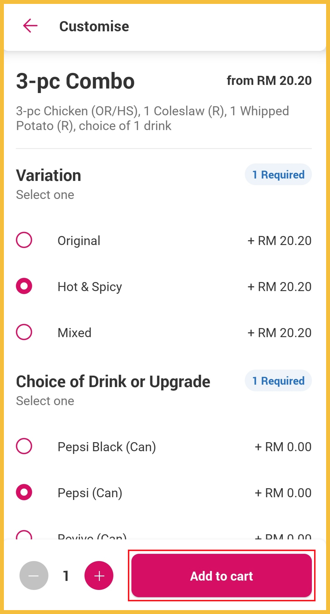 步骤3:选择炸鸡口味及饮料后,点击「Add To Cart」。