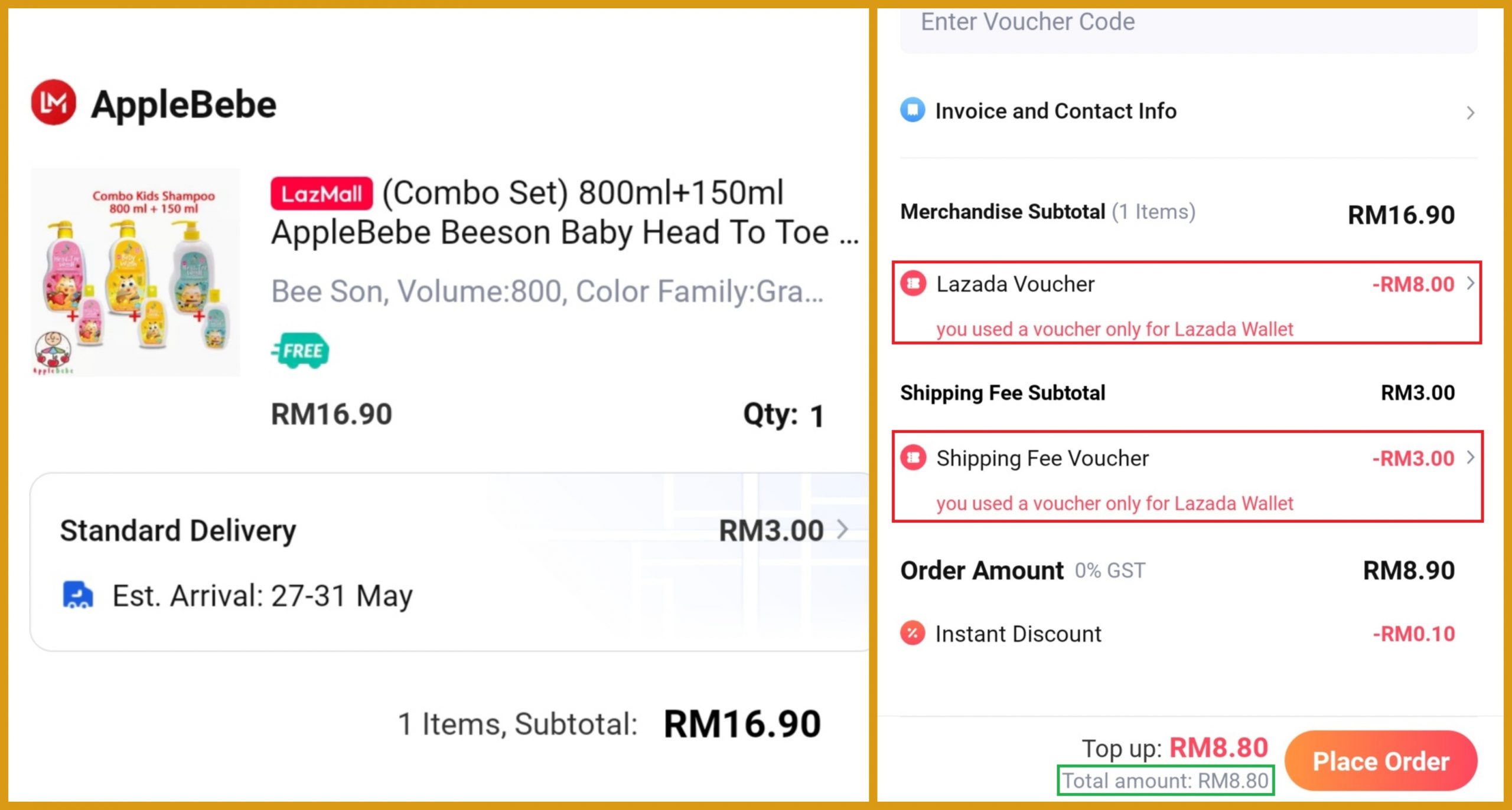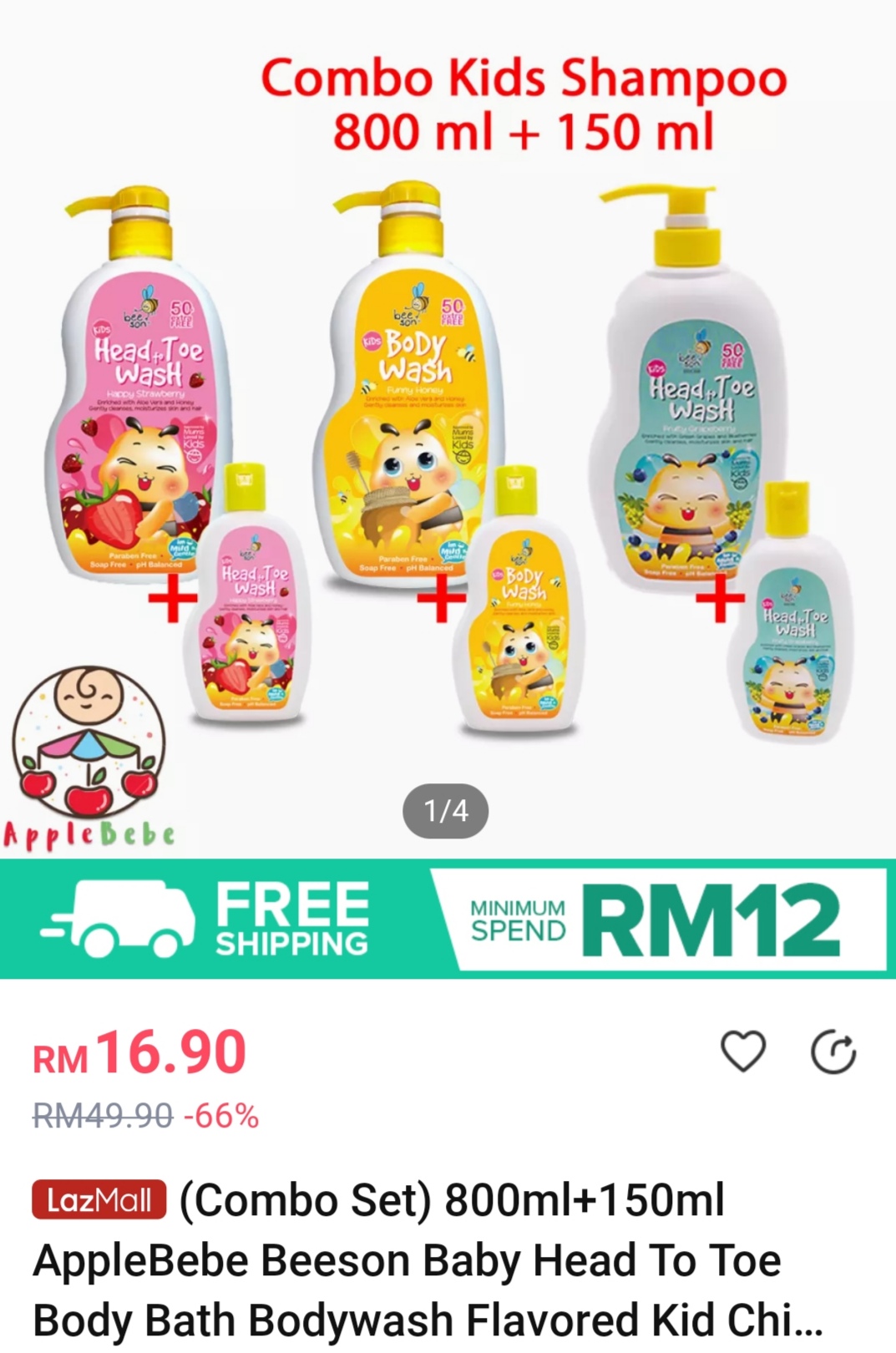※ 购买1套(800ml+150ml)沐浴露(原价RM16.90)折扣55% + Lazada Wallet 支付可折扣RM0.10 + 免邮费只需RM8.80!