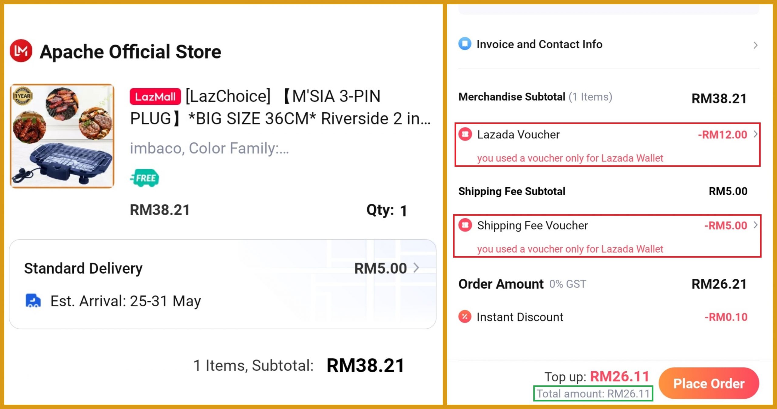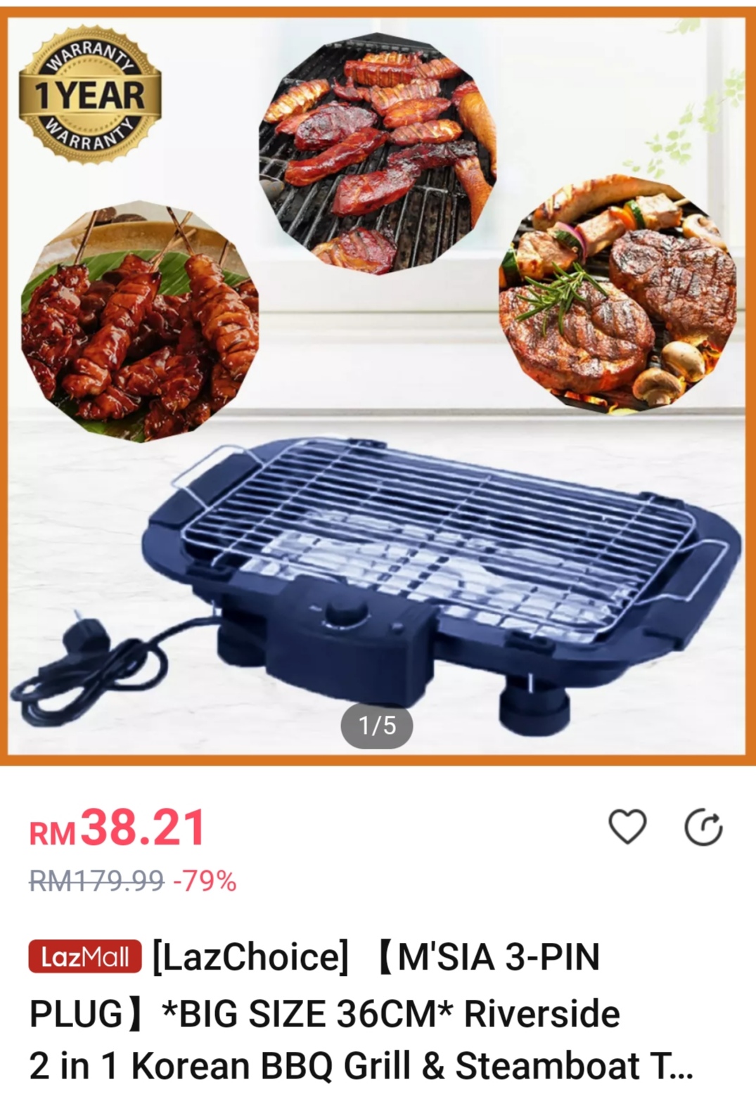 ※ 2 in 1 BBQ烧烤炉(原价RM38.21)折扣55% + Lazada Wallet 支付可折扣RM0.10 + 免邮费只需RM26.21!