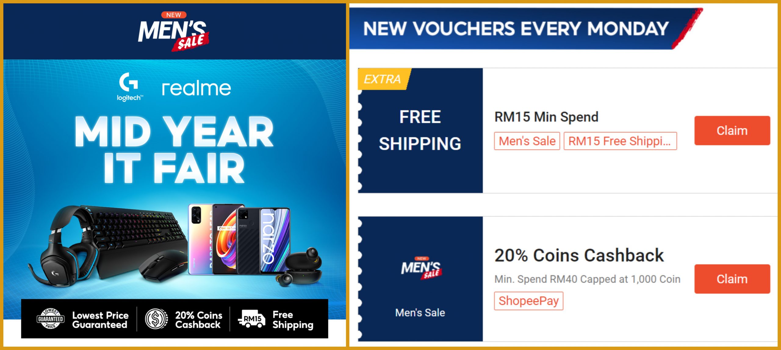 ① 首先打开Shopee App,领取每逢星期一Shopee Men’s Sale 20%现金回扣券和免邮券【点击这里】