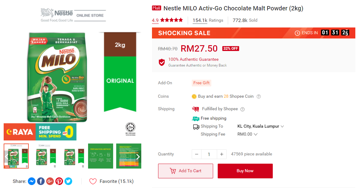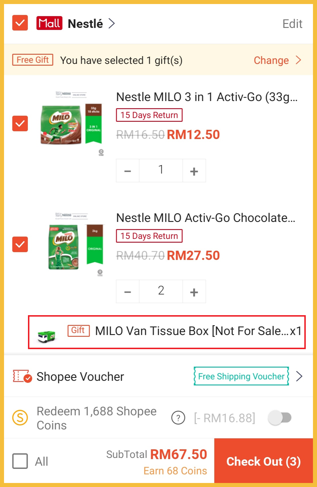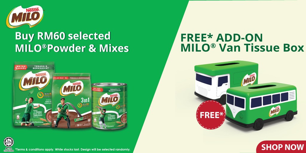 这次的优惠是由Shopee Nestle 官网联合所推出促销活动!只要你购买RM60 指定Milo 就可免费获得限量版Milo 造型纸巾盒!