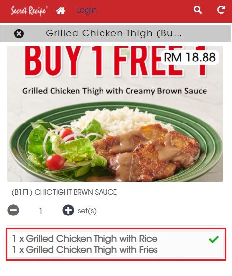 买一送一的选择只有Grilled Chicken Thighs with Brown Souce哦!不过你可以任选要配白饭或薯条!