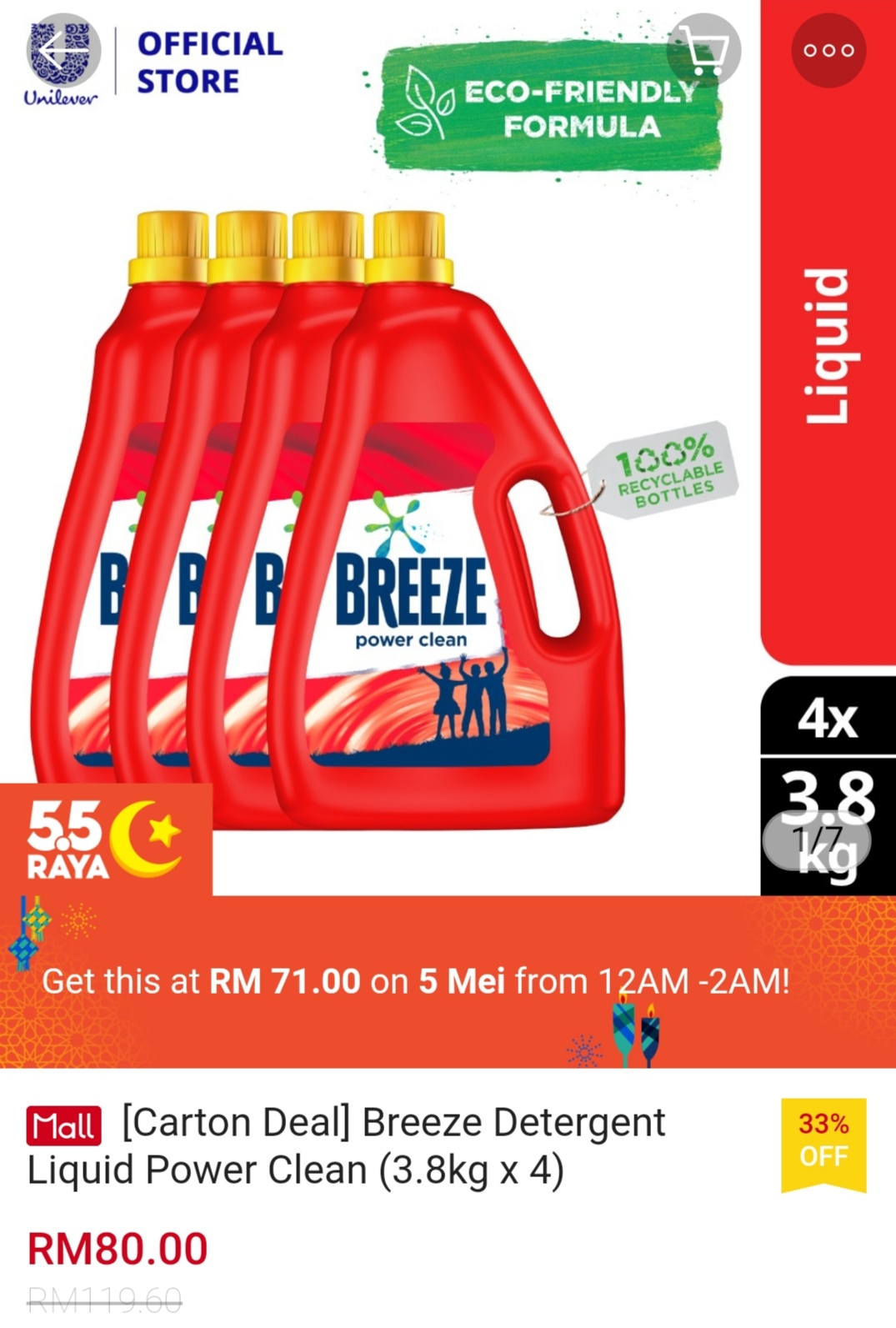 ▪ Breeze Detergent Liquid Power Clean (3.8kg x 4) – RM119.60 RM71