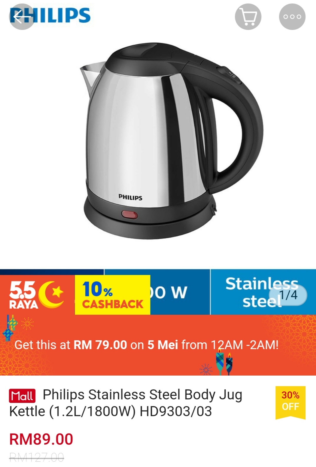▪ Philips Stainless Steel Body Jug Kettle (1.2L/1800W) HD9303/03 – RM127 RM79