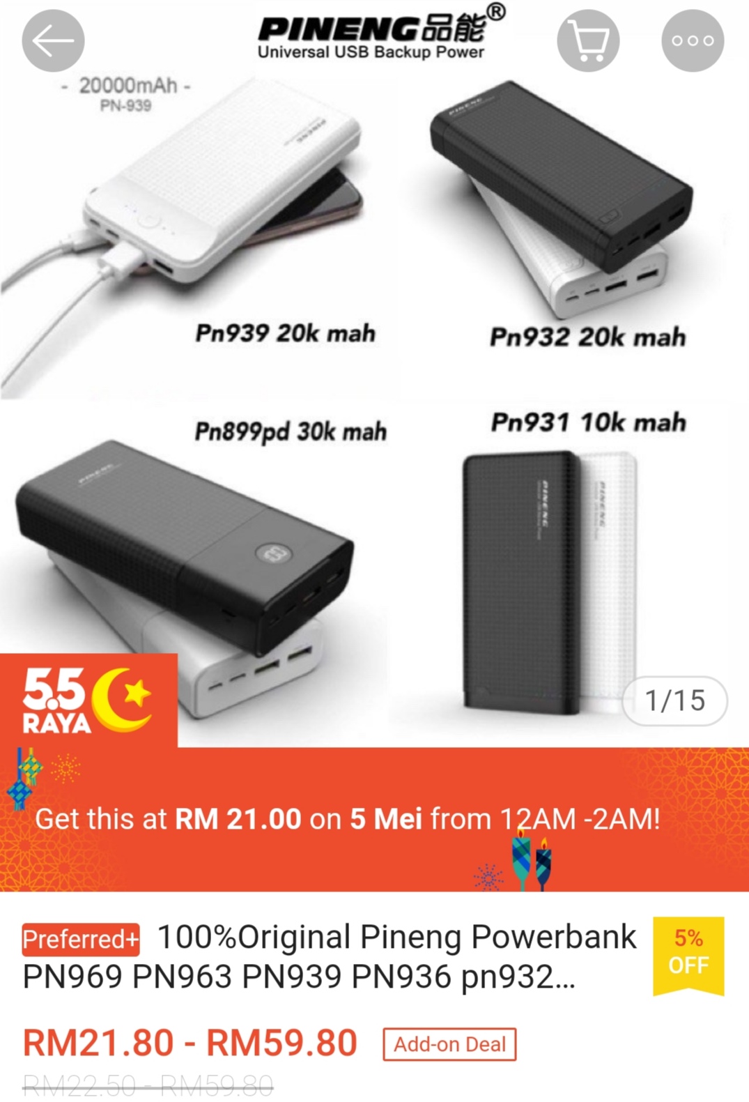 ▪ 100%Original Pineng Powerbank – RM22.50 – RM59.80 RM21