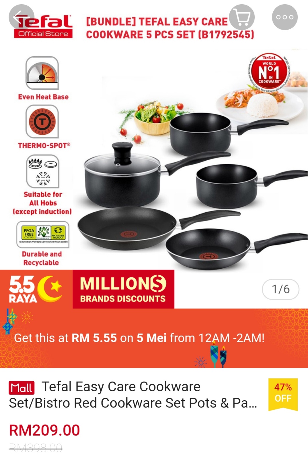 ▪ Tefal Easy Care Cookware Set/Bistro Red Cookware Set Pots & Pans – Frypan/Milkpan/Saucpan/Lid (5 Pcs) – RM398 RM5.55