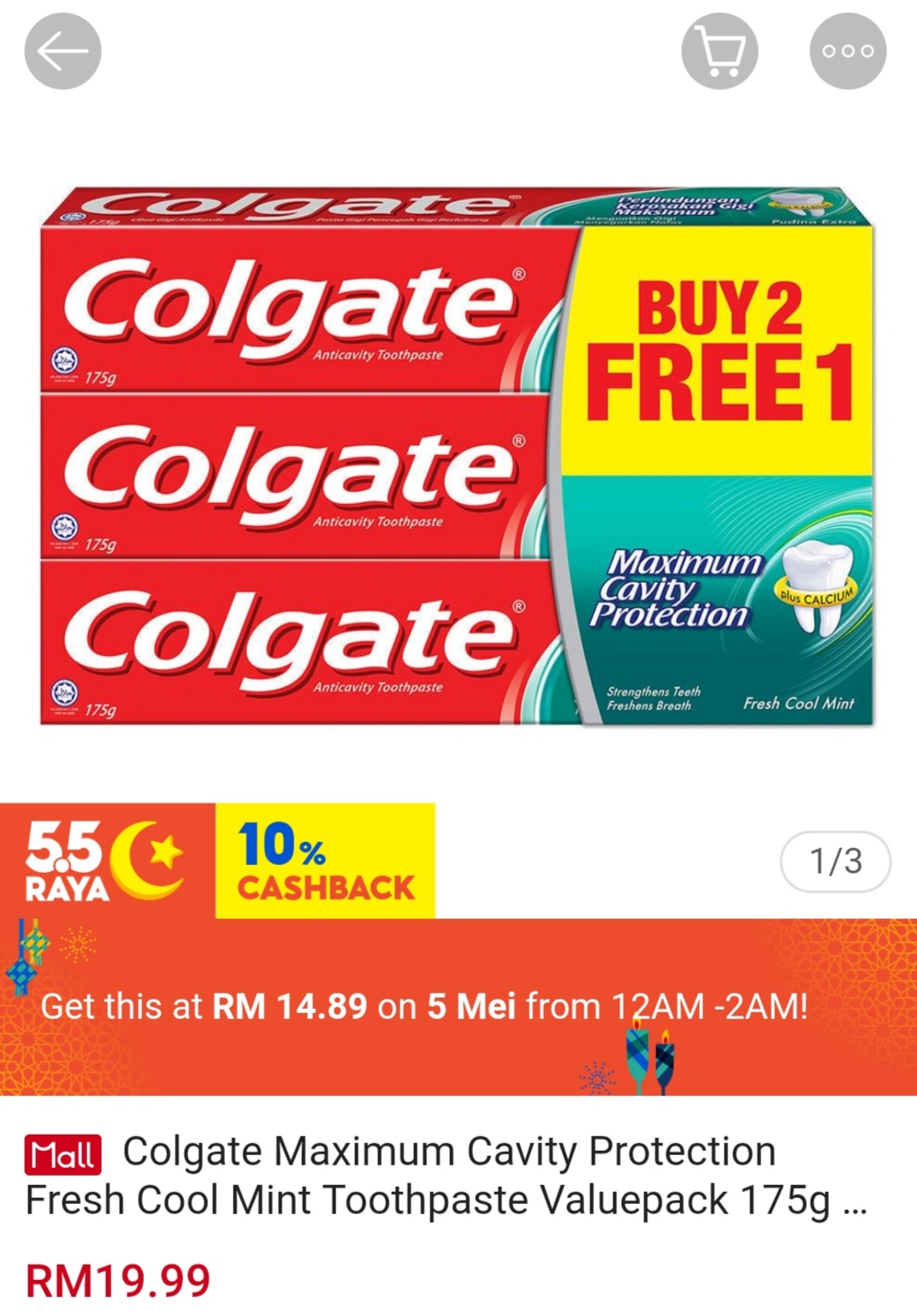 ▪ Colgate Maximum Cavity Protection Fresh Cool Mint Toothpaste Valuepack 175g x 3 – RM19.99 RM14.89