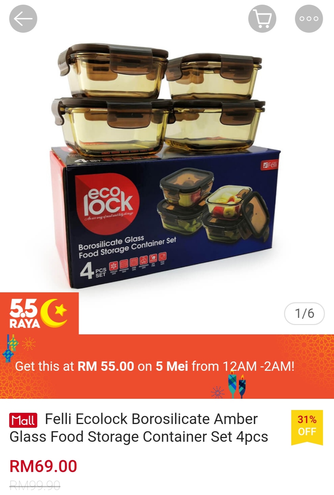 ▪ Felli Ecolock Borosilicate Amber Glass Food Storage Container Set 4pcs – RM99.90 RM55
