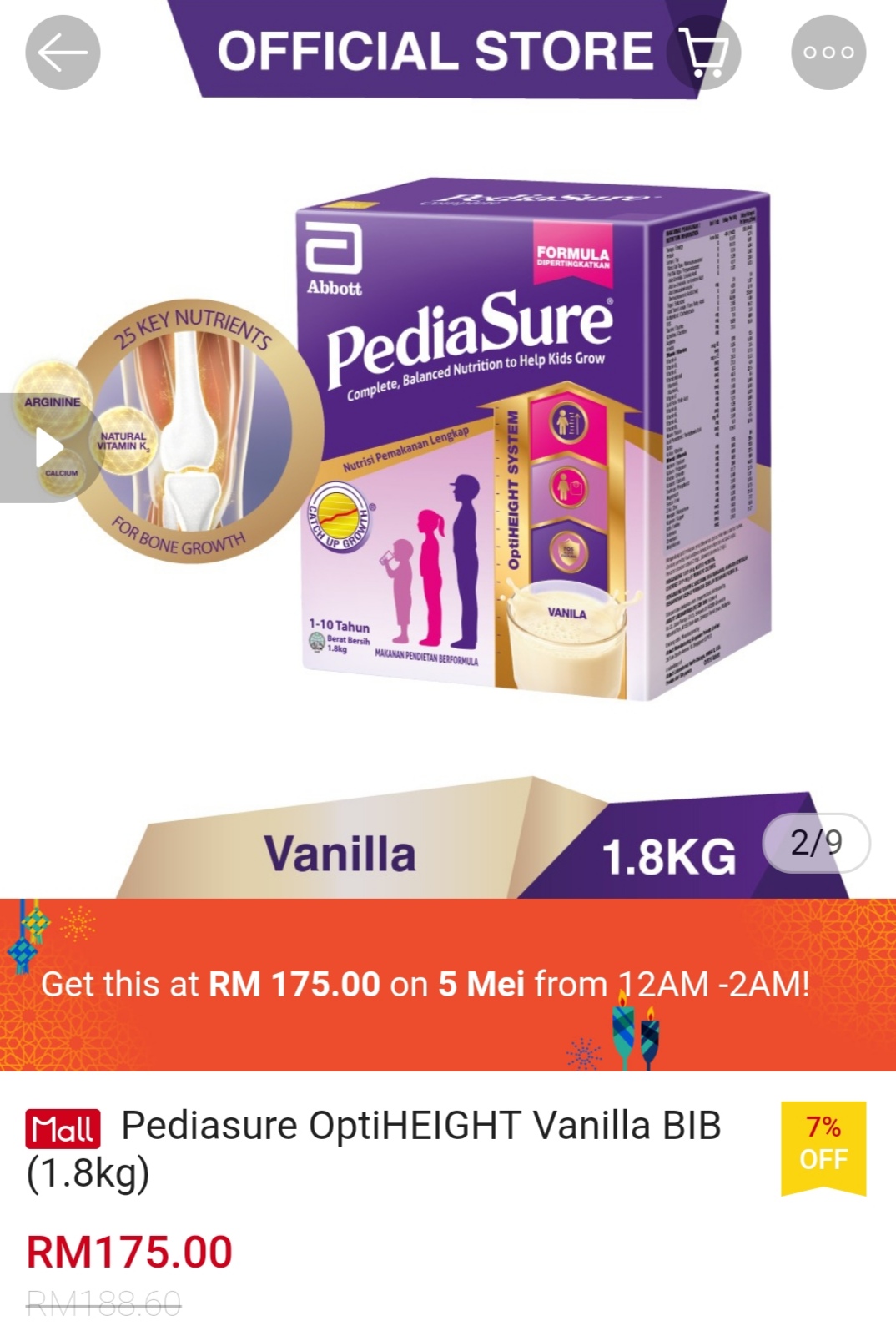 ▪ Pediasure OptiHEIGHT Vanilla BIB (1.8kg) – RM188.60 RM175