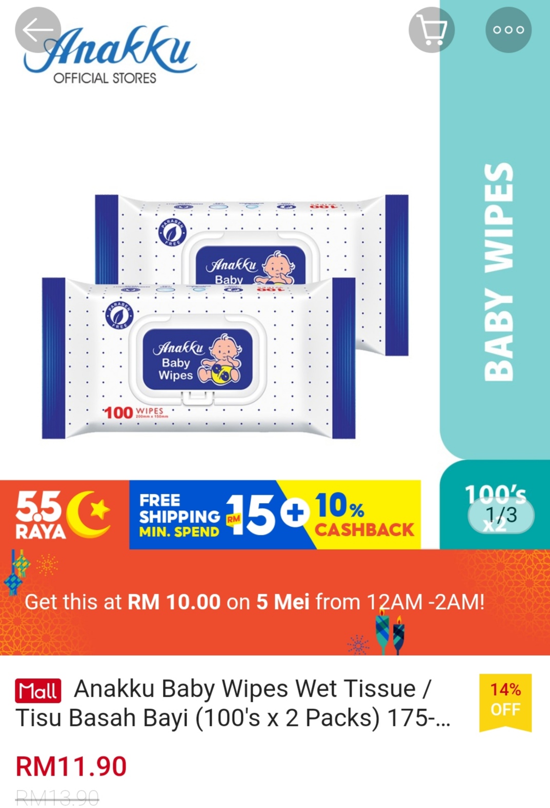 ▪ Anakku Baby Wipes Wet Tissue / Tisu Basah Bayi (100’s x 2 Packs) 175-1001 – RM13.90 RM10