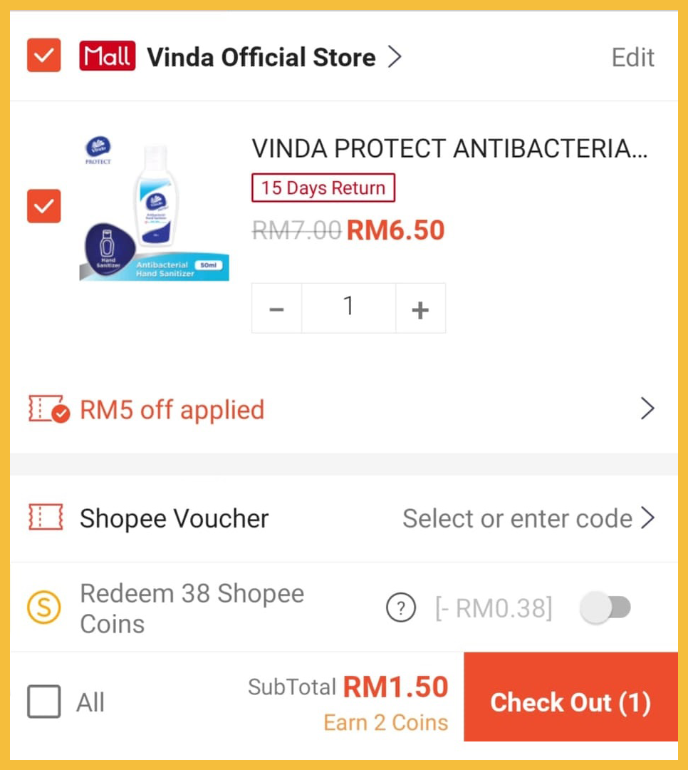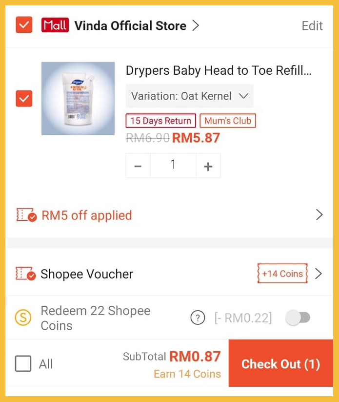 ① 首先必须到shopee mum’s club 领取Vinda RM5的折扣券!