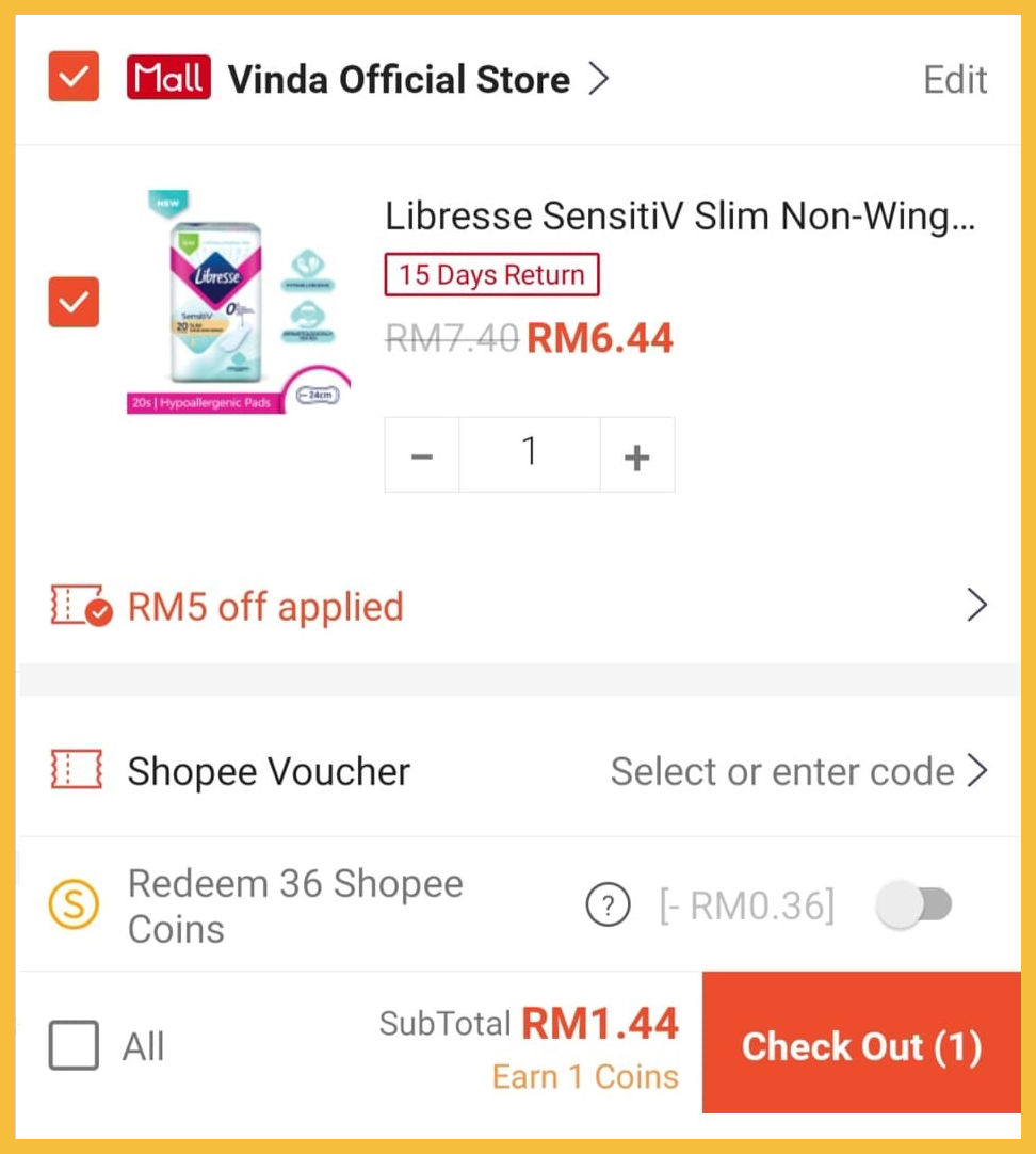 ※ 配合Vinda RM5 Voucher+ Free Shipping Voucher,一包Libress 卫生巾只需RM1.44