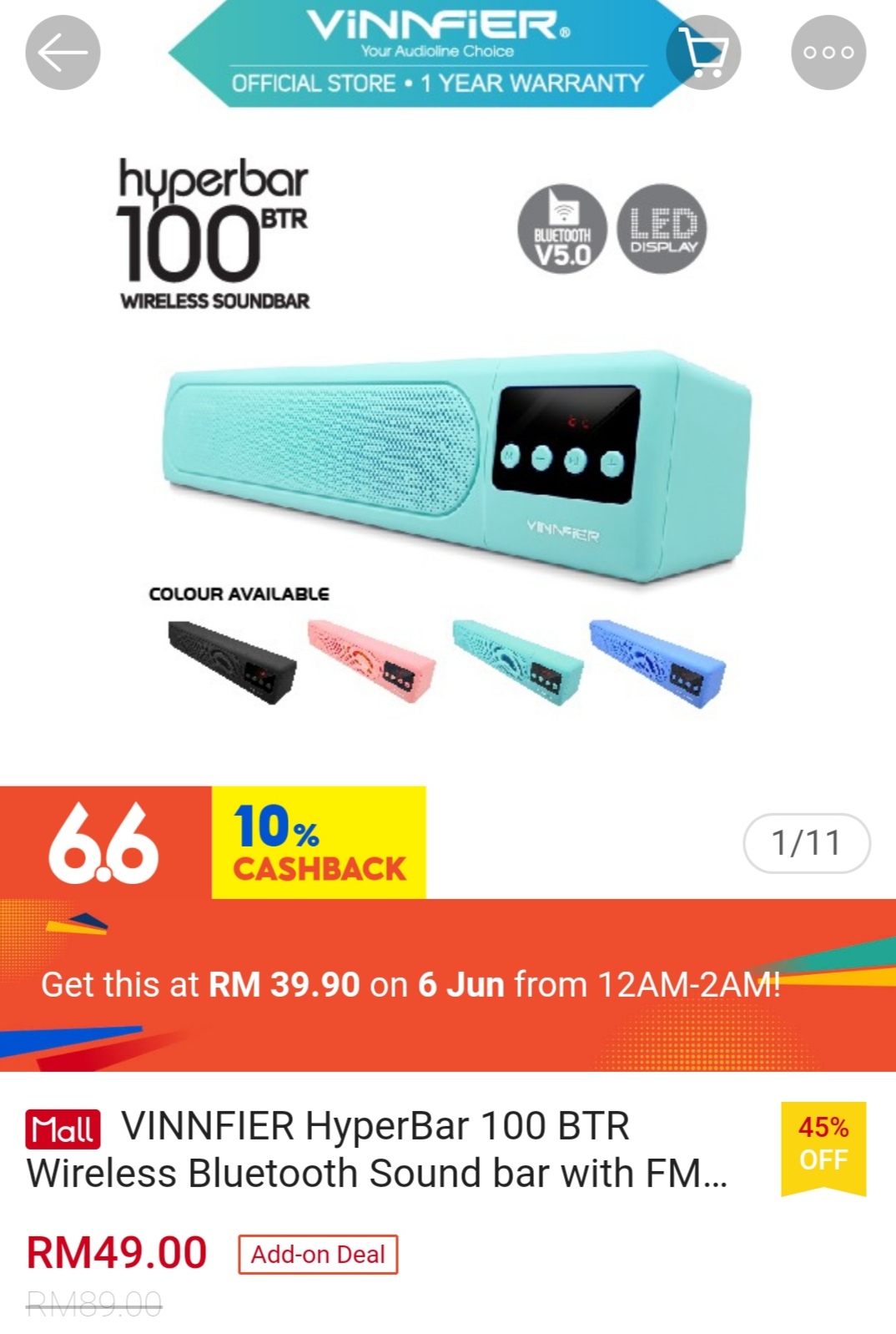 ▪ VINNFIER HyperBar 100 BTR Wireless Bluetooth Sound bar with FM Radio USB Slot SD Card Slot and LED Display – RM89 RM39.90