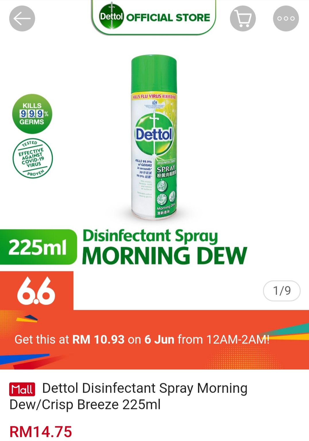 ▪ Dettol Disinfectant Spray Morning Dew/Crisp Breeze 225ml – RM14.75 RM10.93