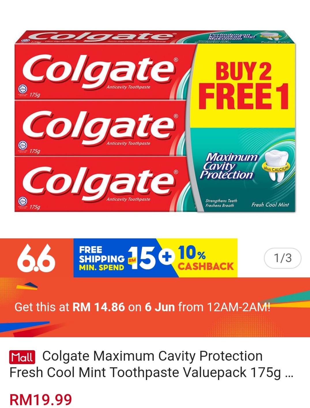 ▪ Colgate Maximum Cavity Protection Fresh Cool Mint Toothpaste Valuepack 175g x 3 – RM19.99 RM14.86