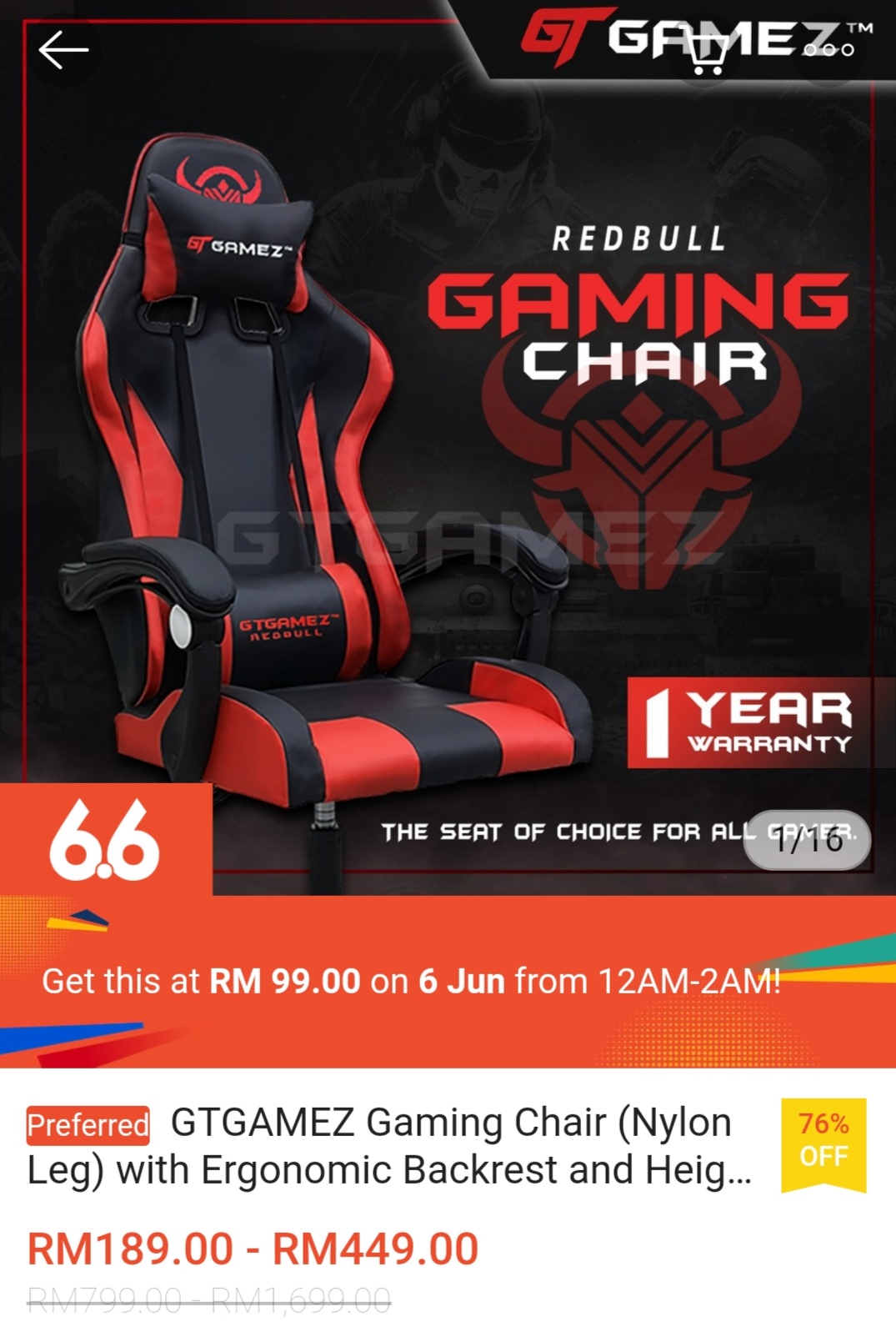 ▪ GTGAMEZ Gaming Chair (Nylon Leg) with Ergonomic Backrest and Height Adjustment + Pillows Recliner Swivel GMZ-GC-YG-721 – RM799 – RM1699 RM99