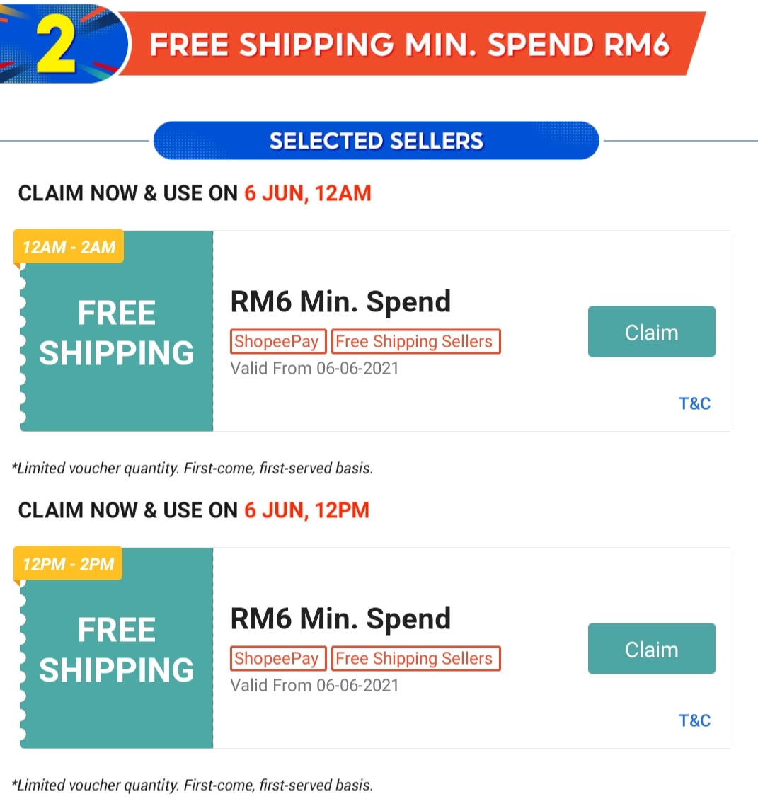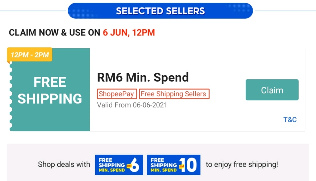 凌晨12am、12pm及8pm 可享有最低RM6 免邮券!一定要去Claim!