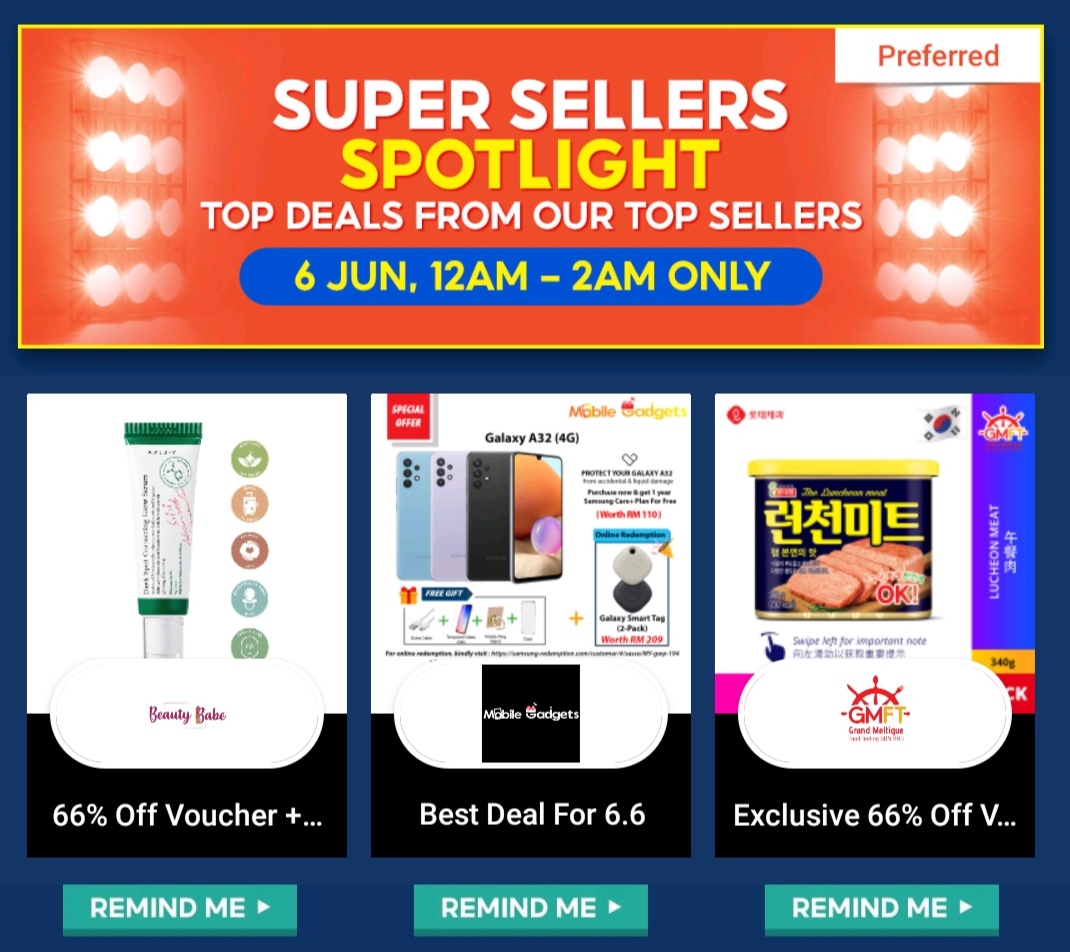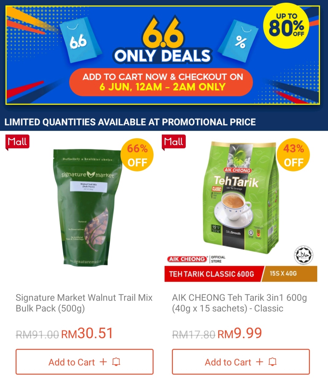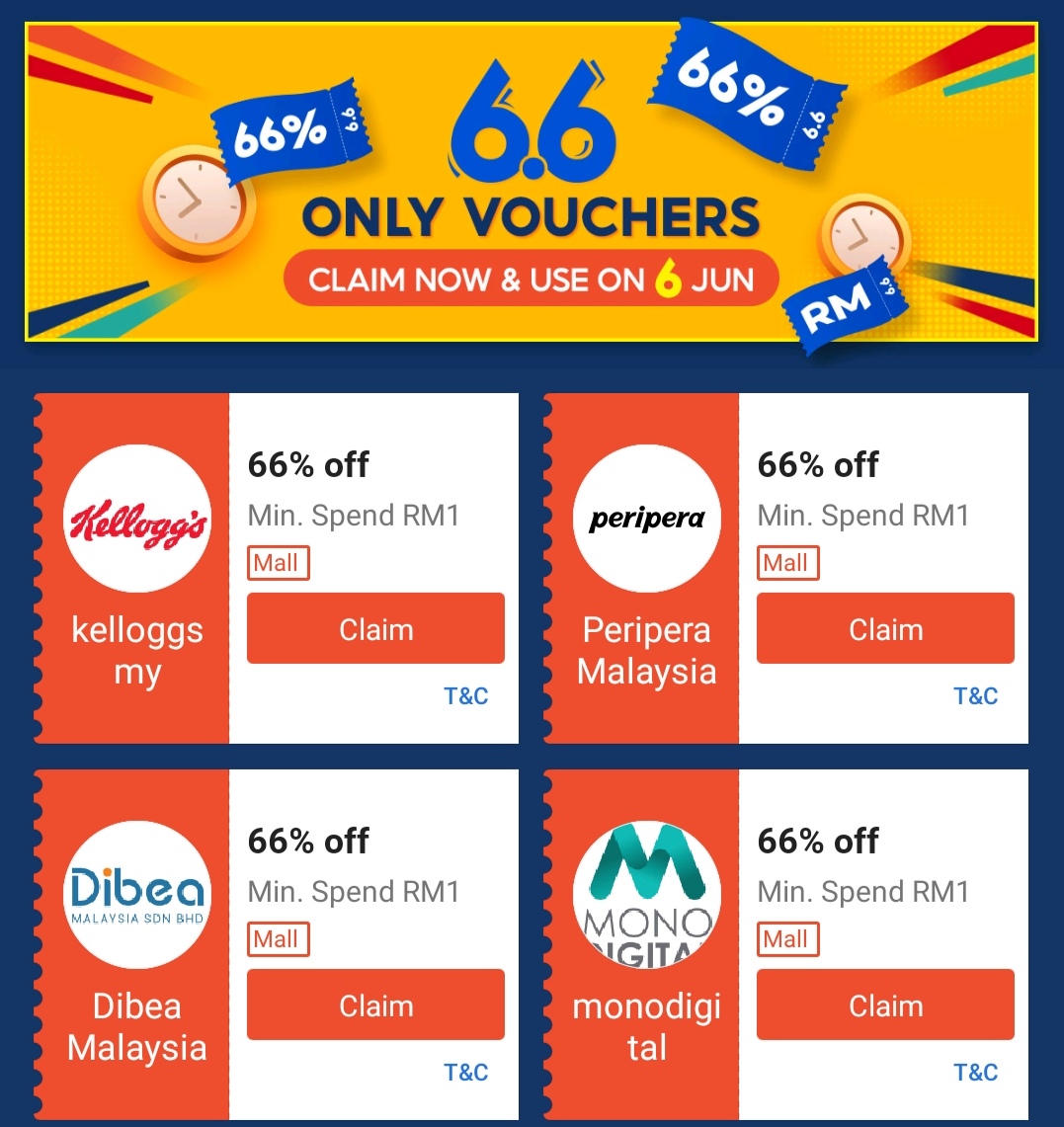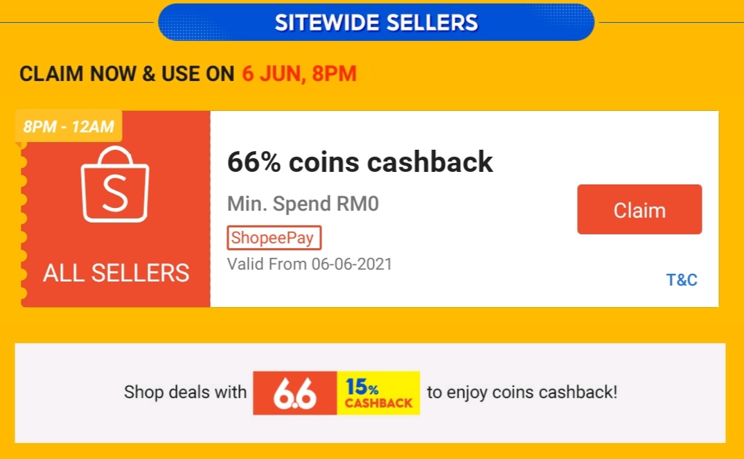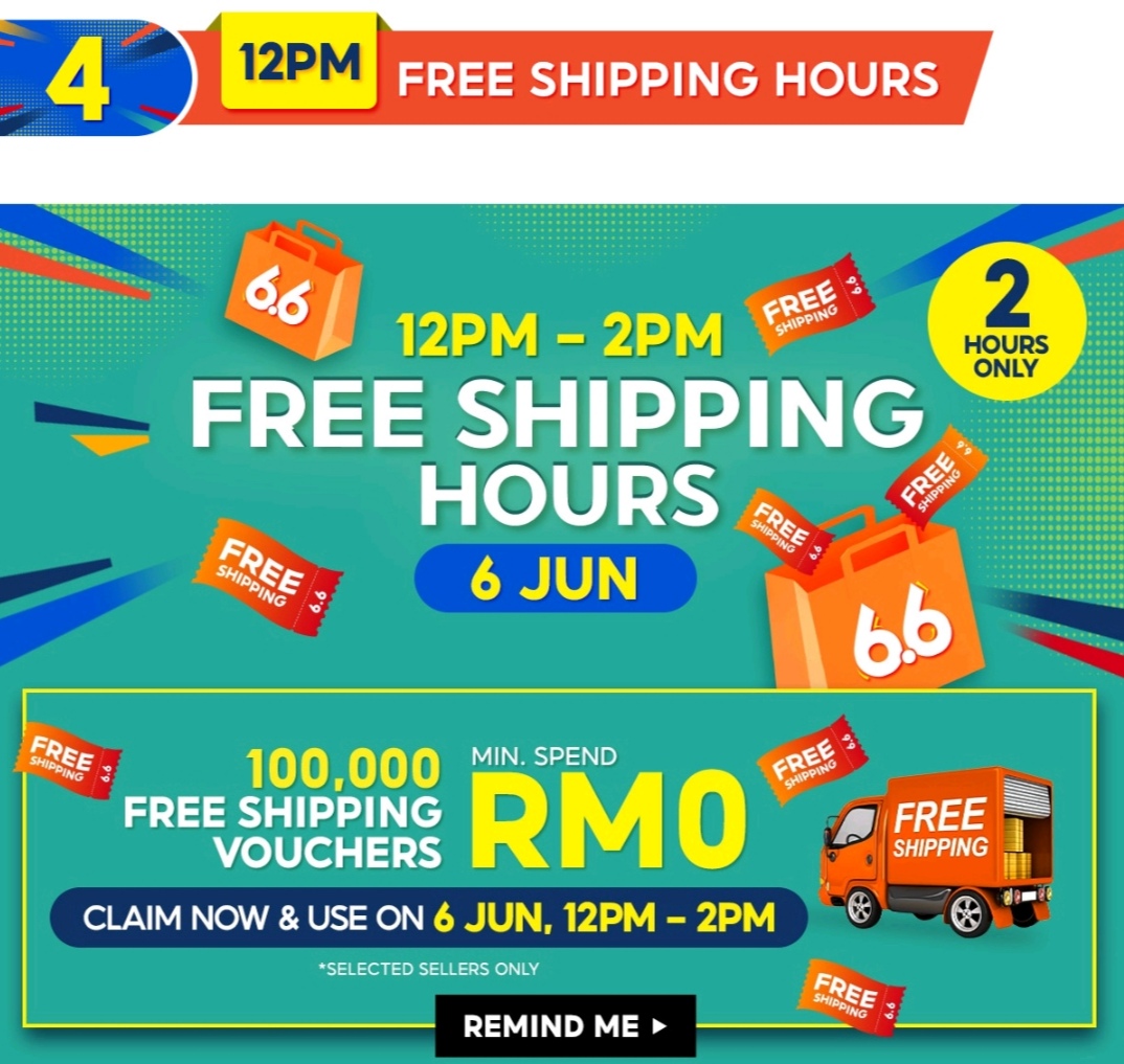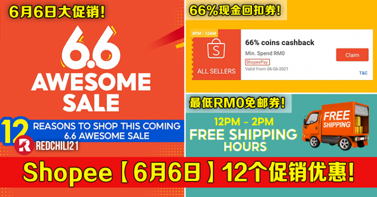 Shopee 用户可在6月6日当天享有最低RM0 免邮券、66%现金回扣券及高达66%折扣的商品!