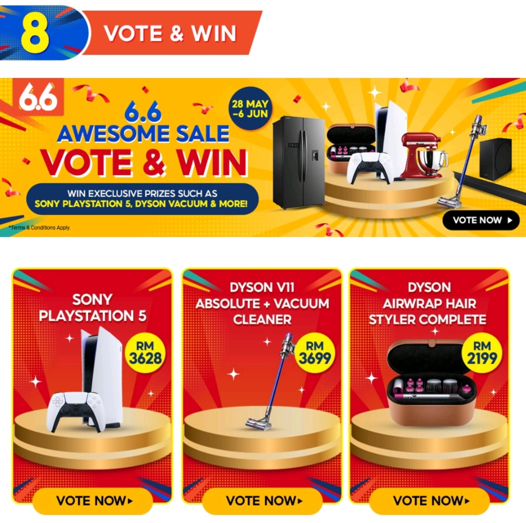 6.6当天Shopee 还举办Vote & Win 赢取奖品活动!有机会获得Sony PlayStation 5,Dyson V11吸尘器、Toshiba冰箱等的奖品