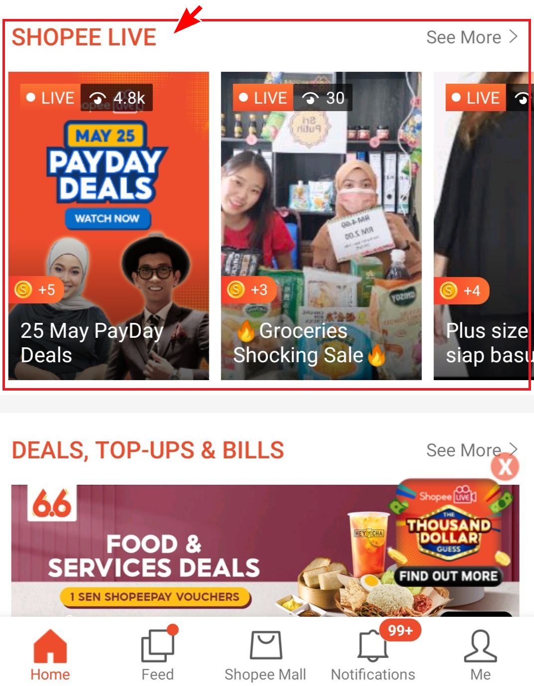 步骤2:在页面中往下滑到Shopee Live 区域,点击「See More」。