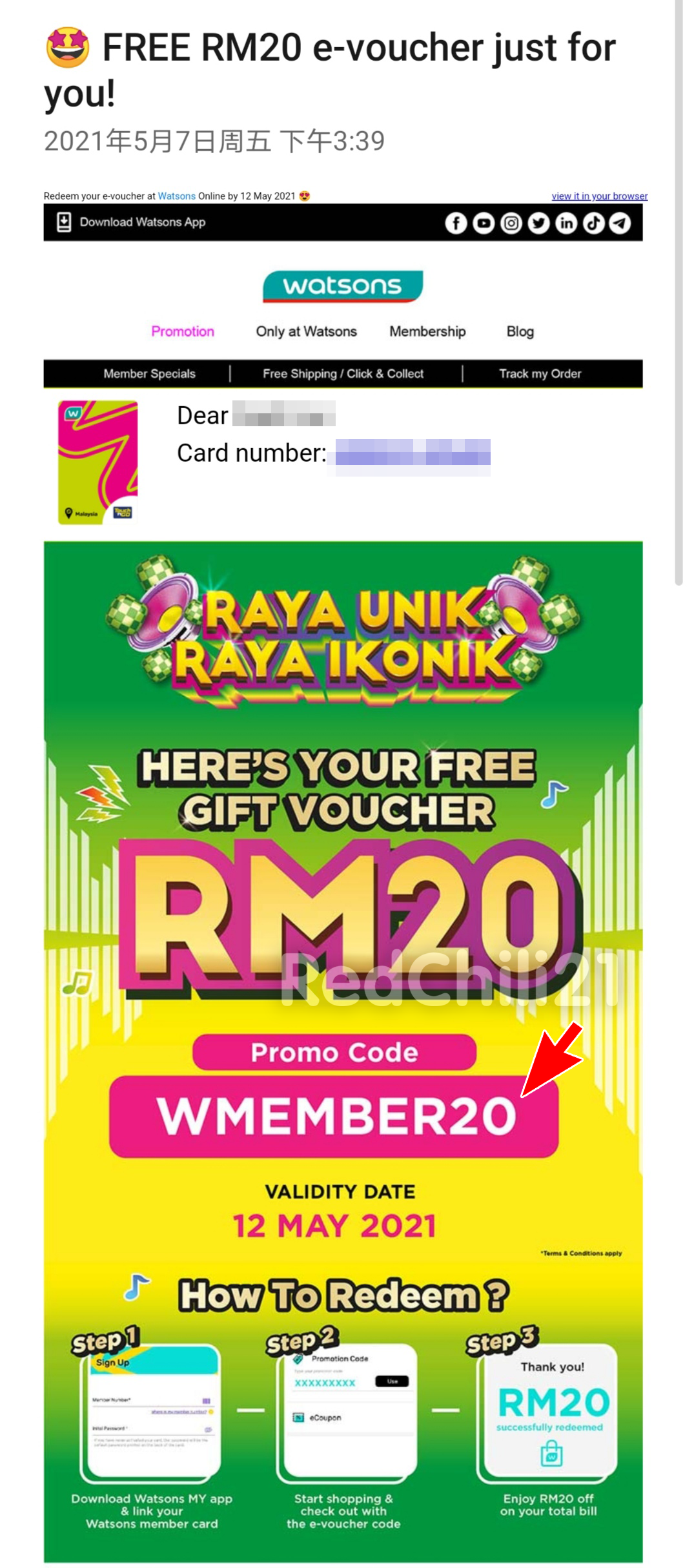 步骤1:首先检查你的电子邮件,是否有接收到一封Watsons 免费RM20 折扣券!