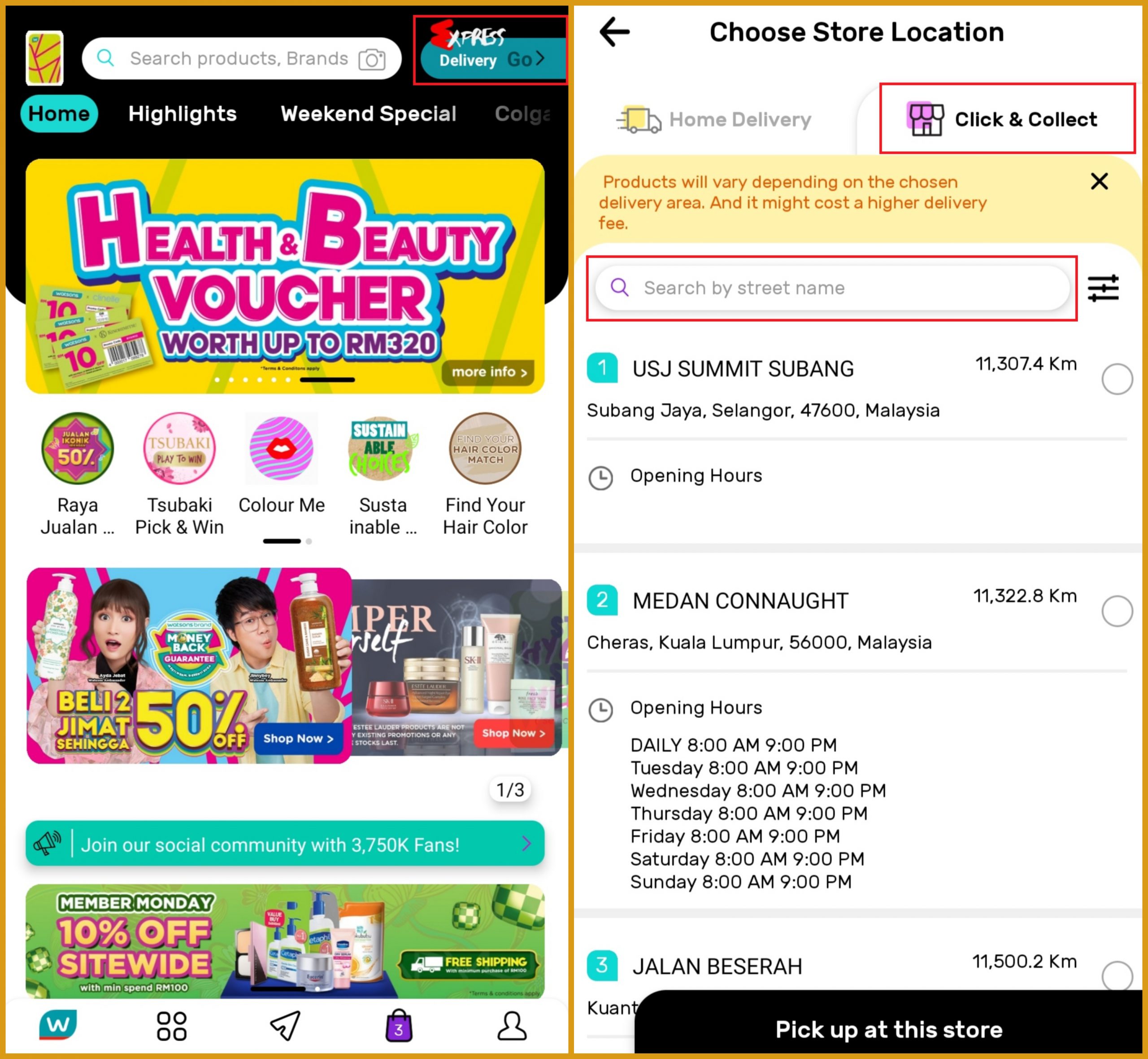步骤2:打开你Watsons App,小编选择Express Delivery Go(自行前往分行领取商品),选择你想领取商品的Watsons 分行!