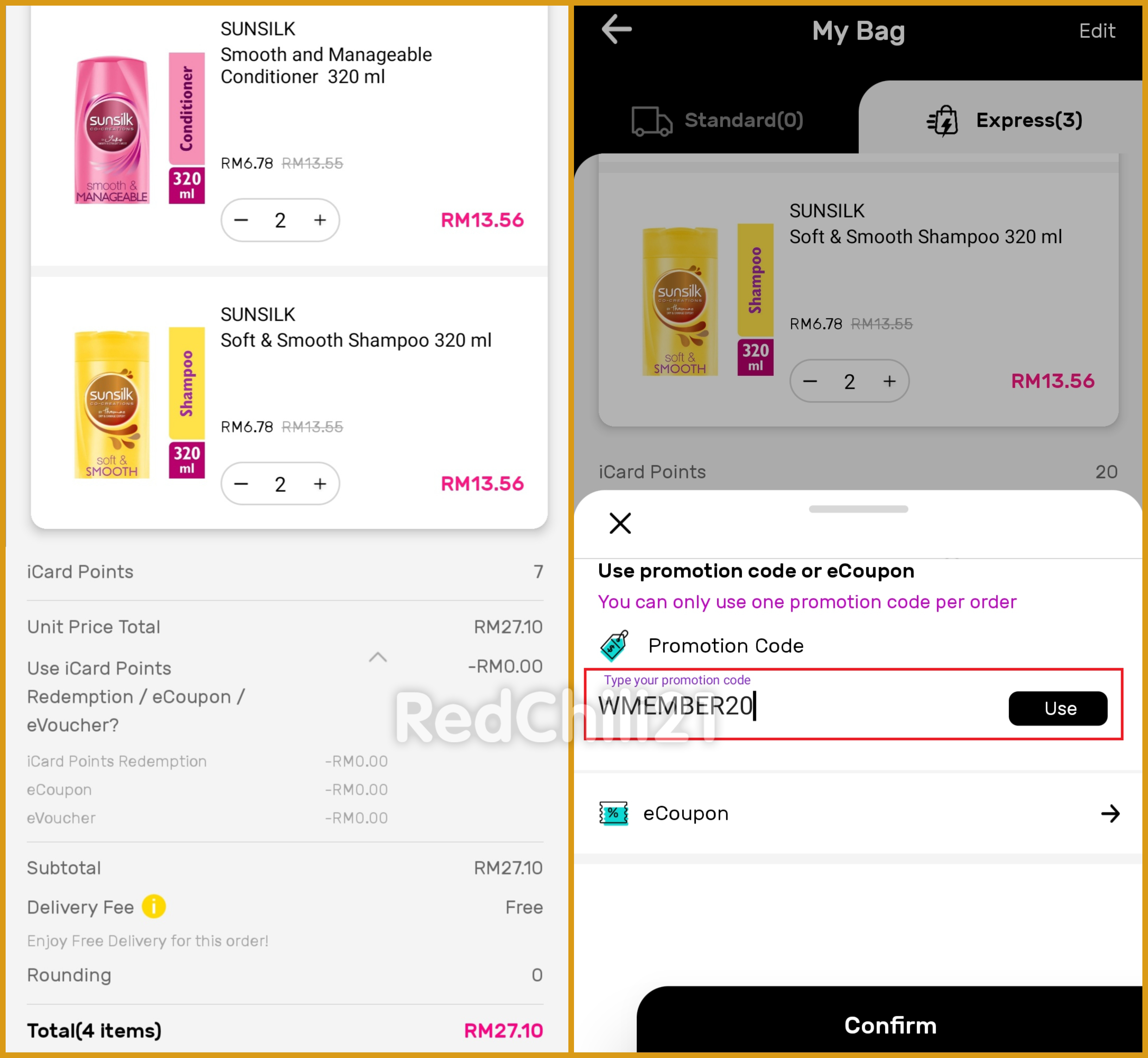 步骤4:为了能使用这张RM20 折扣券,小编购买2瓶Sunsilk 洗发液和2瓶护发素!