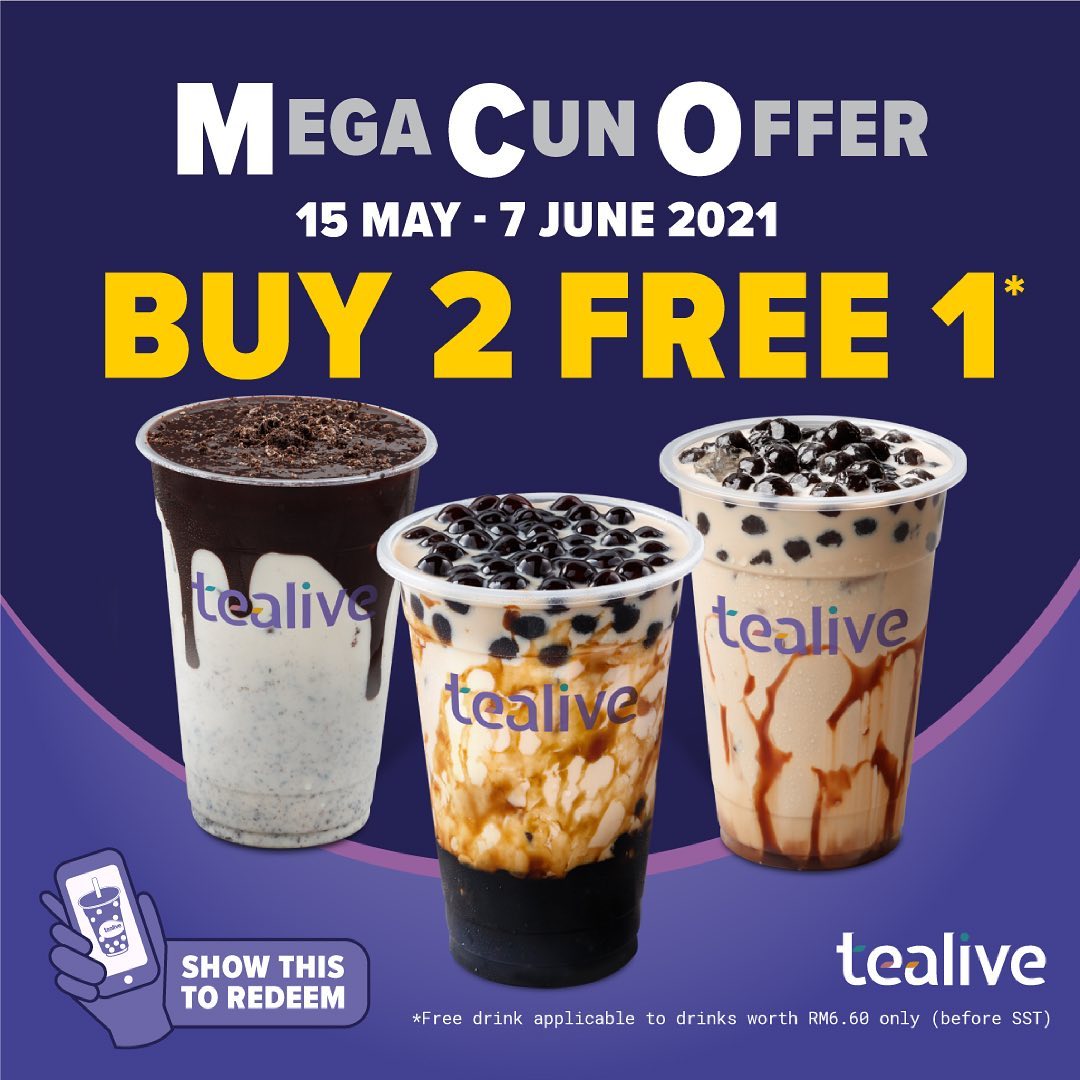 从即日起至6月7日,只要前往临近的Tealive 分店购买两杯饮料,就可免费获得一杯饮料!