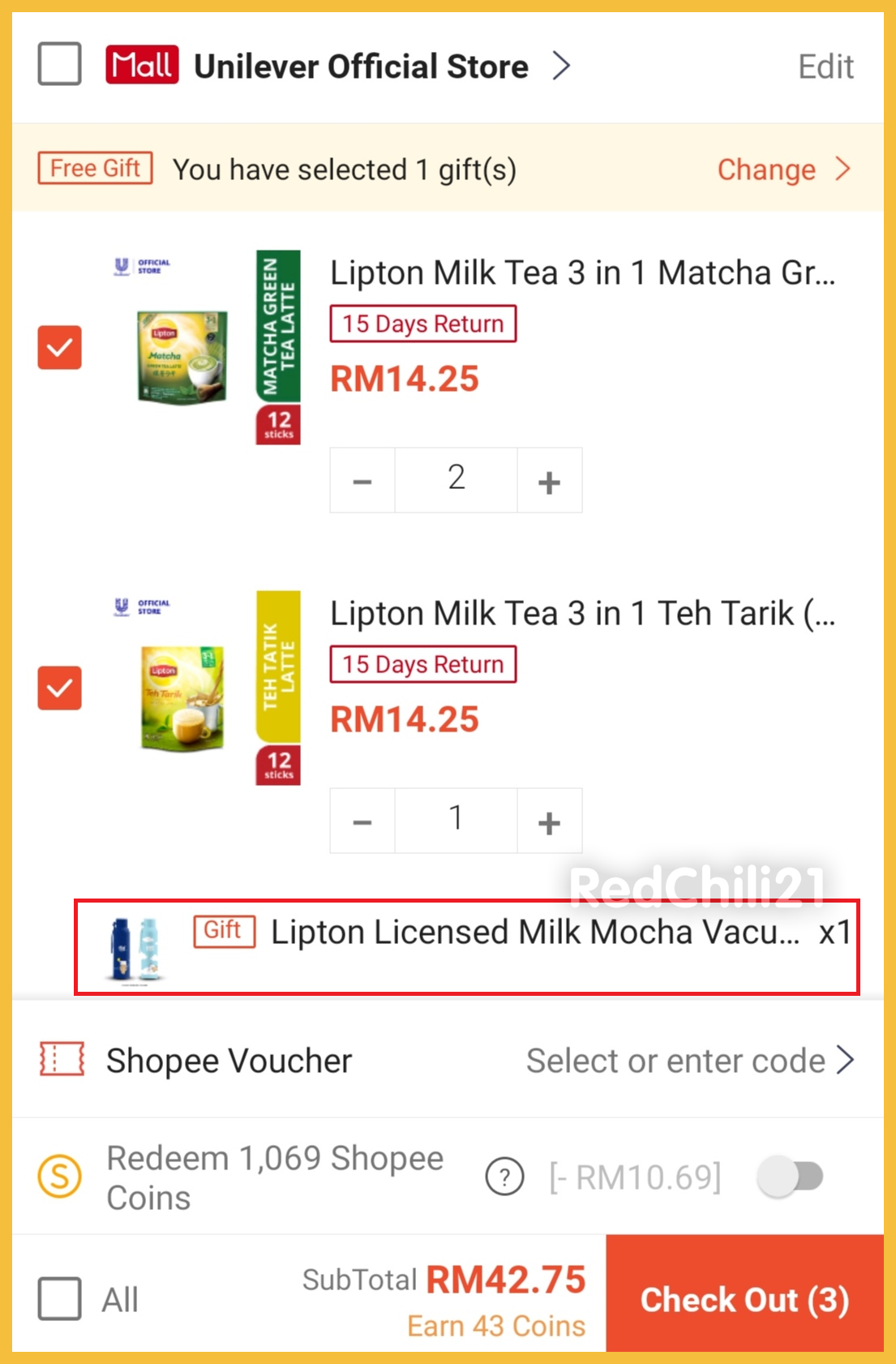促销活动:购买RM25 或以上Lipton 商品,免费获得Milk Mocha 水瓶