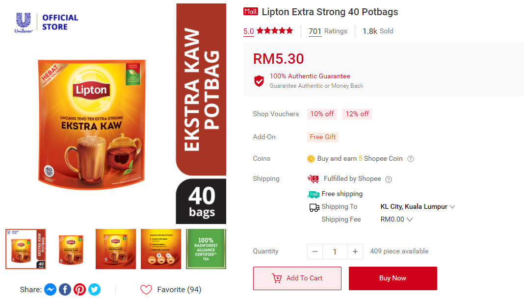 ▼ Lipton Extra Strong 40 Potbags – RM5.30;购买【点击这里】