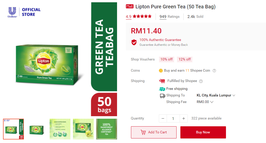 ▼ Lipton Pure Green Tea (50 Tea Bag) – RM11.40;购买【点击这里】
