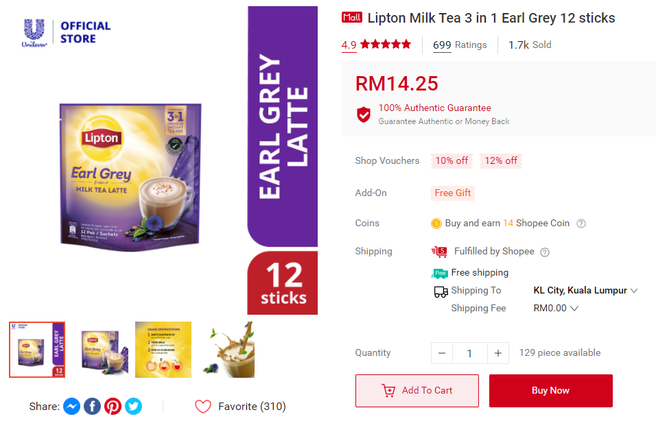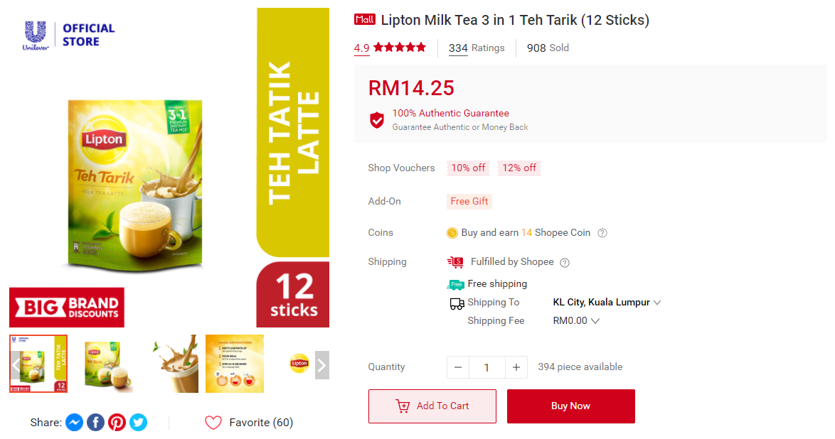 ▼ Lipton Milk Tea 3 in 1 Teh Tarik (12 Sticks) – RM14.25;购买【点击这里】