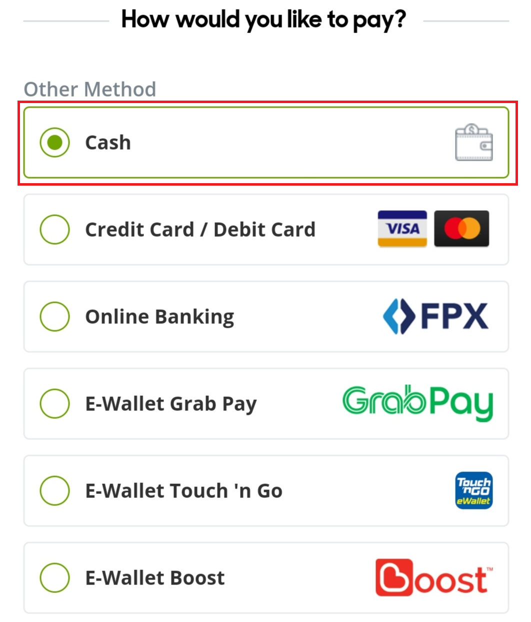步骤 9:选择“Cash” 方式支付(前往你选择的分行领取食物及付款)
