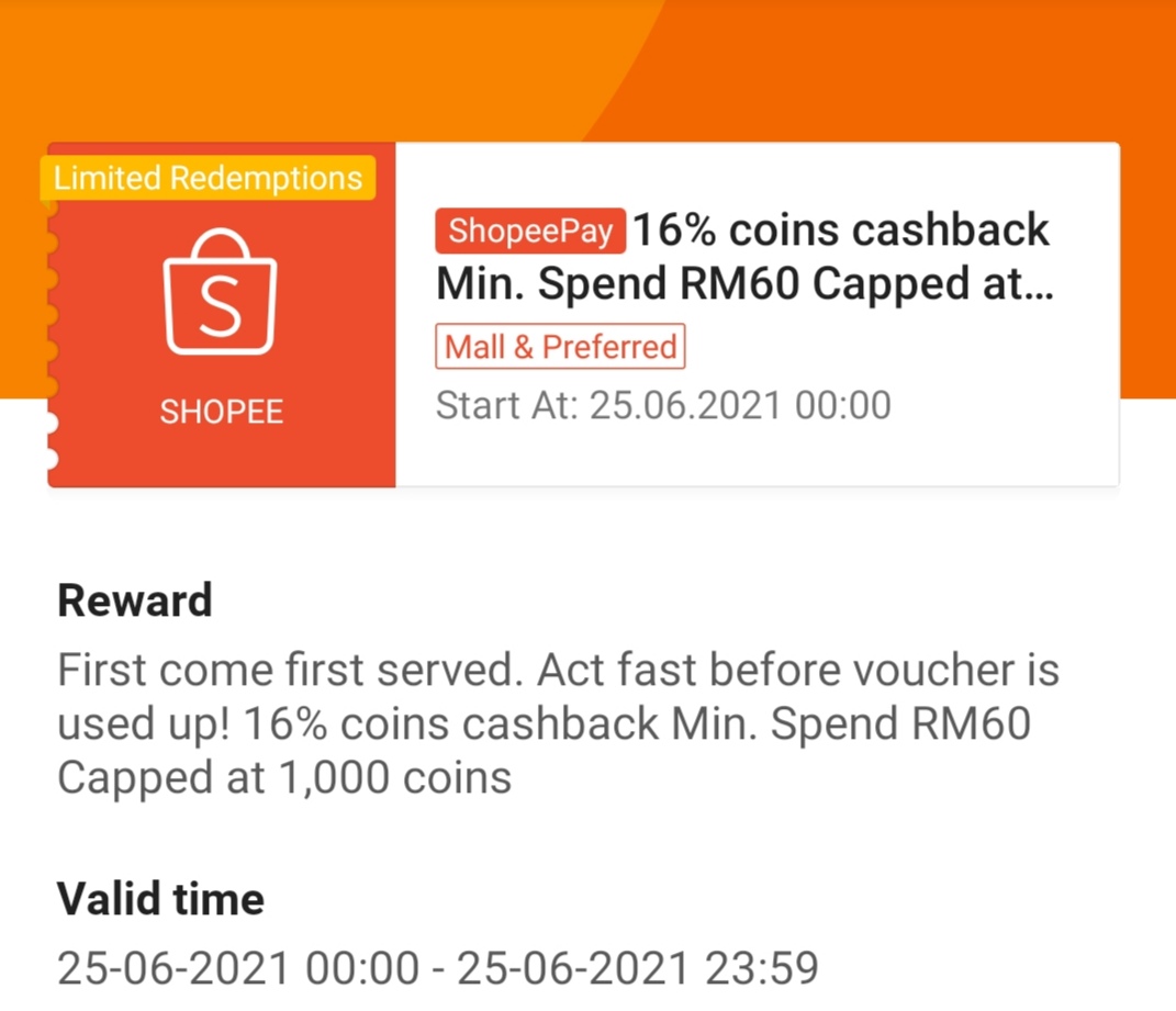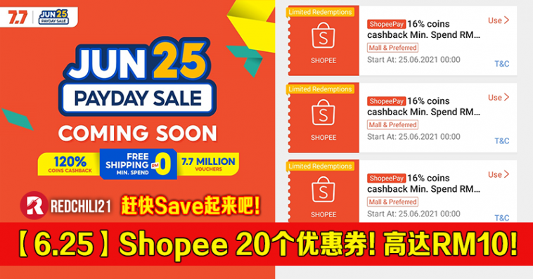 【6.25】Shopee 20个优惠券!高达RM10 Shopee币!赶快Save起来吧!