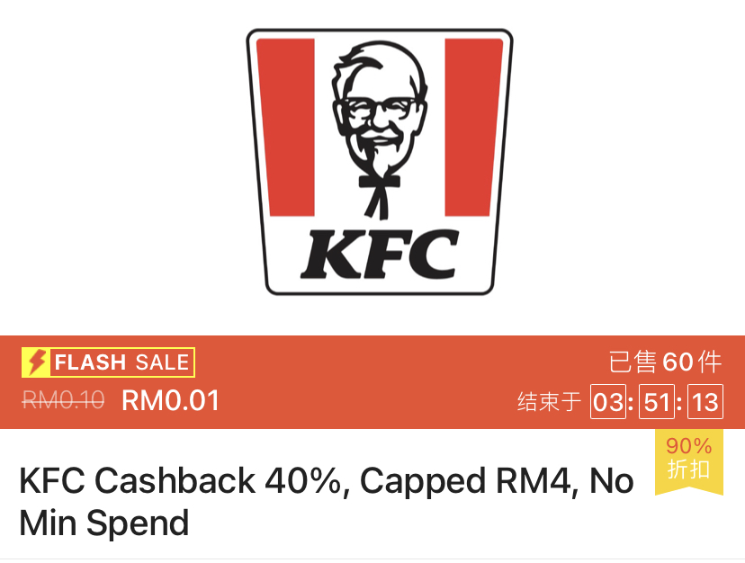 ▼ ① KFC – 40%现金回扣(最高折扣RM4 / 无需最低消费)【点击这里】