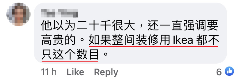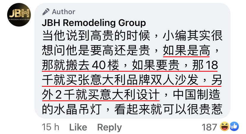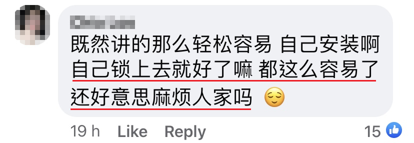 什么都要包,设计费就算了(反正在马來西亚设计师也和空气一样,不用钱免费吸),还要免费安装这么多的淘宝櫥具?这样和你去打包炒粿條要求加蛋加鮮蛤就不加钱,有什么区別?