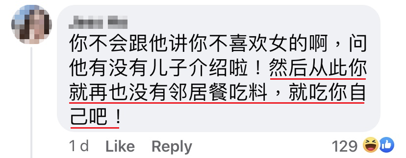 每次给食物我的时候就不断问我的工作、爱情状况、寂不寂寞等等,反正我祖宗十八代都给她问完了。后来才知道,原来是想介绍女儿给我认识。